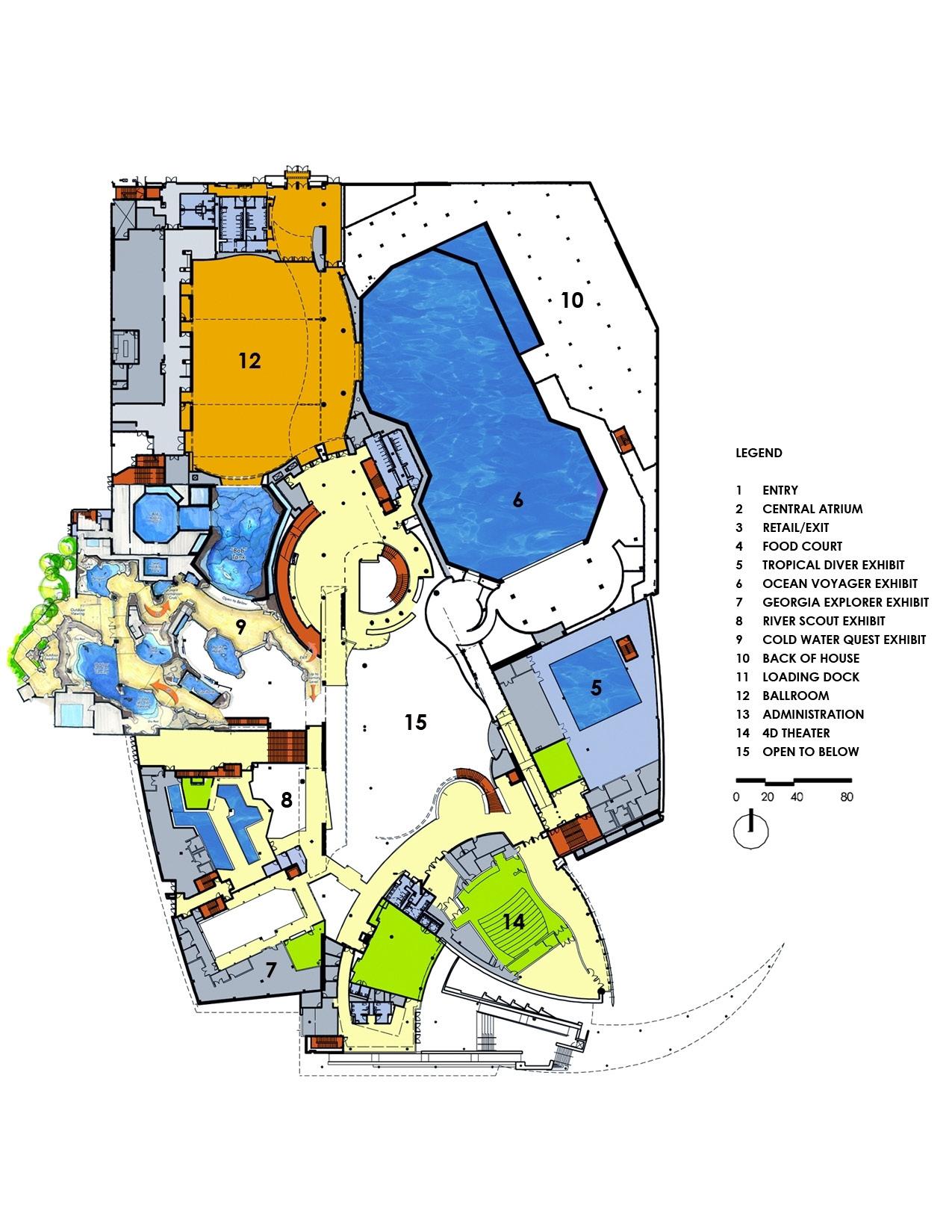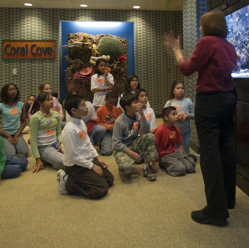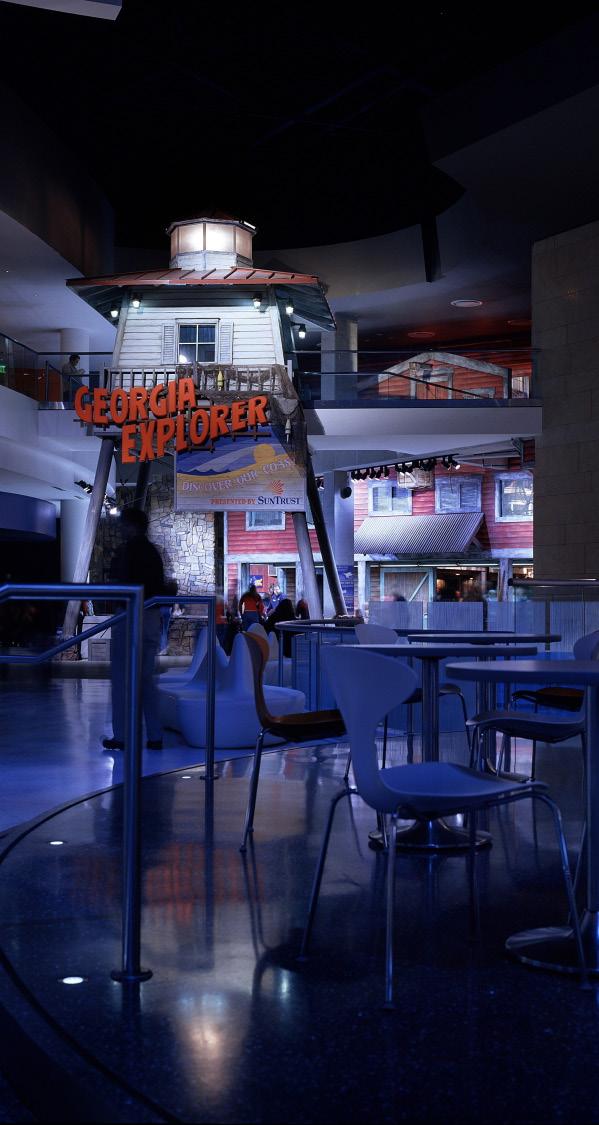 With a threefold mission of entertainment, education and conservation, the Georgia Aquarium has devoted its second story to a limited-access Education Loop, a series of classrooms in which student groups can experience a unique view of the galleries from overhead. Exhibit themes are continued in the classrooms. For example, the classroom overlooking the Georgia Coast exhibit consists of a boathouse complementing the exhibit’s main floor shrimp boat, and classes on the River Scout exhibit are conducted in a ‘fishing shack’ along the riverbank. Above the Coral Reef exhibit, students learn how coral is formed and examine at eye level a replicated mangrove forest. The location of the Education Loop within the aquarium allows students to access the Aquarium’s dedicated research area, where they have the opportunity to interact with professional researchers on the aquarium staff on actual research projects.