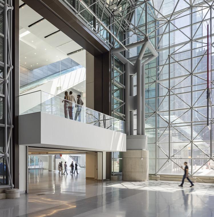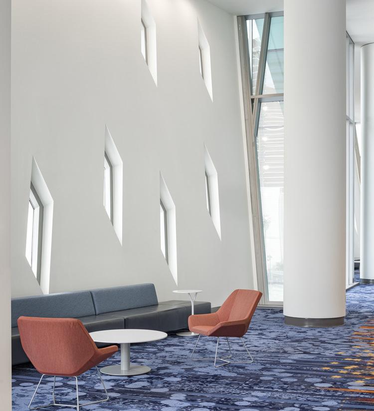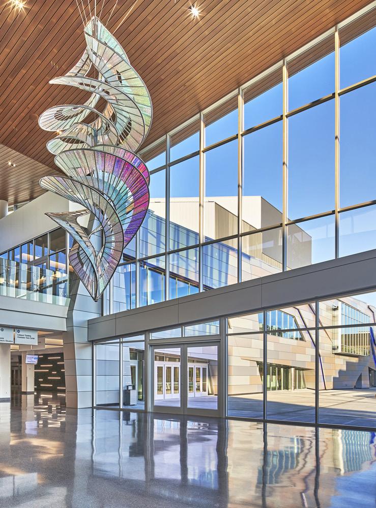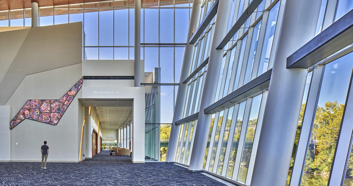 Inspired by the nearby Kanawha River and its historic role as a social organizing link within the rugged landscape that defines the region, the project’s design features three large glass-enclosed lobby nodes, corresponding to each of the building’s major program elements. These iconic spaces instill a navigational clarity to the complex and help to define a unique Charleston event campus.