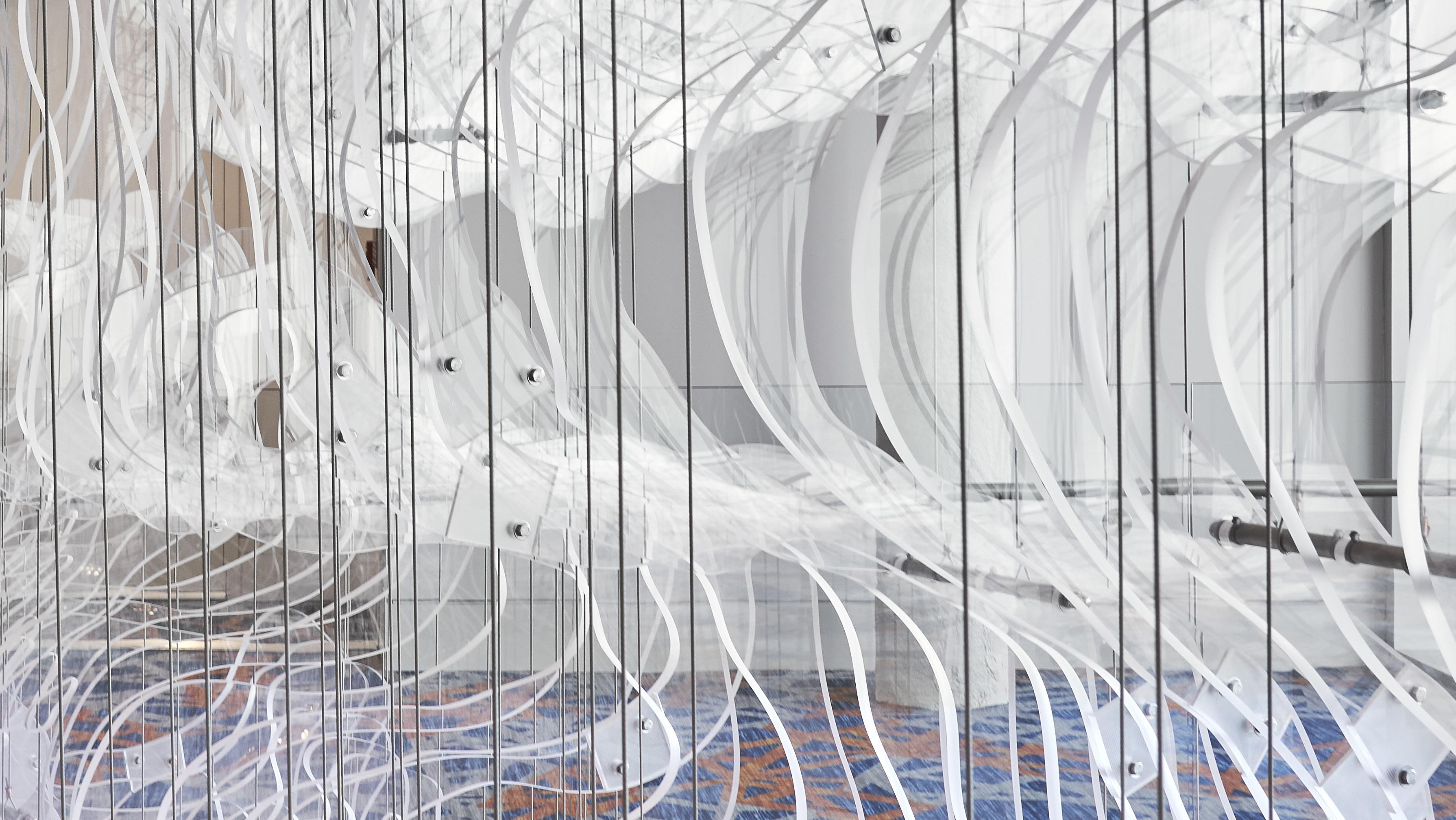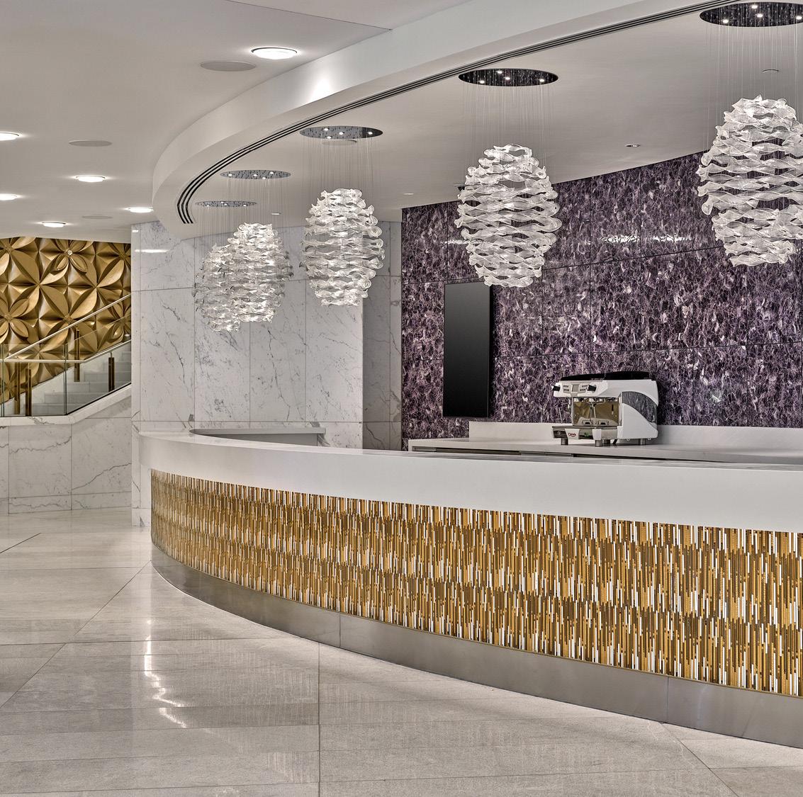 The CEC concourse design is scalloped, giving each three-story entry a unique element, yet a sense of repetition, movement and flow. A stand-out element is the striking, hand-crafted Lasvit chandeliers in the pre-function lobbies. The chandeliers lend each area their own identity. Earth, fire, air and water – sacred elements in Indian philosophy – provide the perfect design inspiration. The concourse ceilings also follow the same iconic lotus-petal theme and have sound absorptive materials that reduce the reflected sound and lets one take in and enjoy their impressive surroundings.