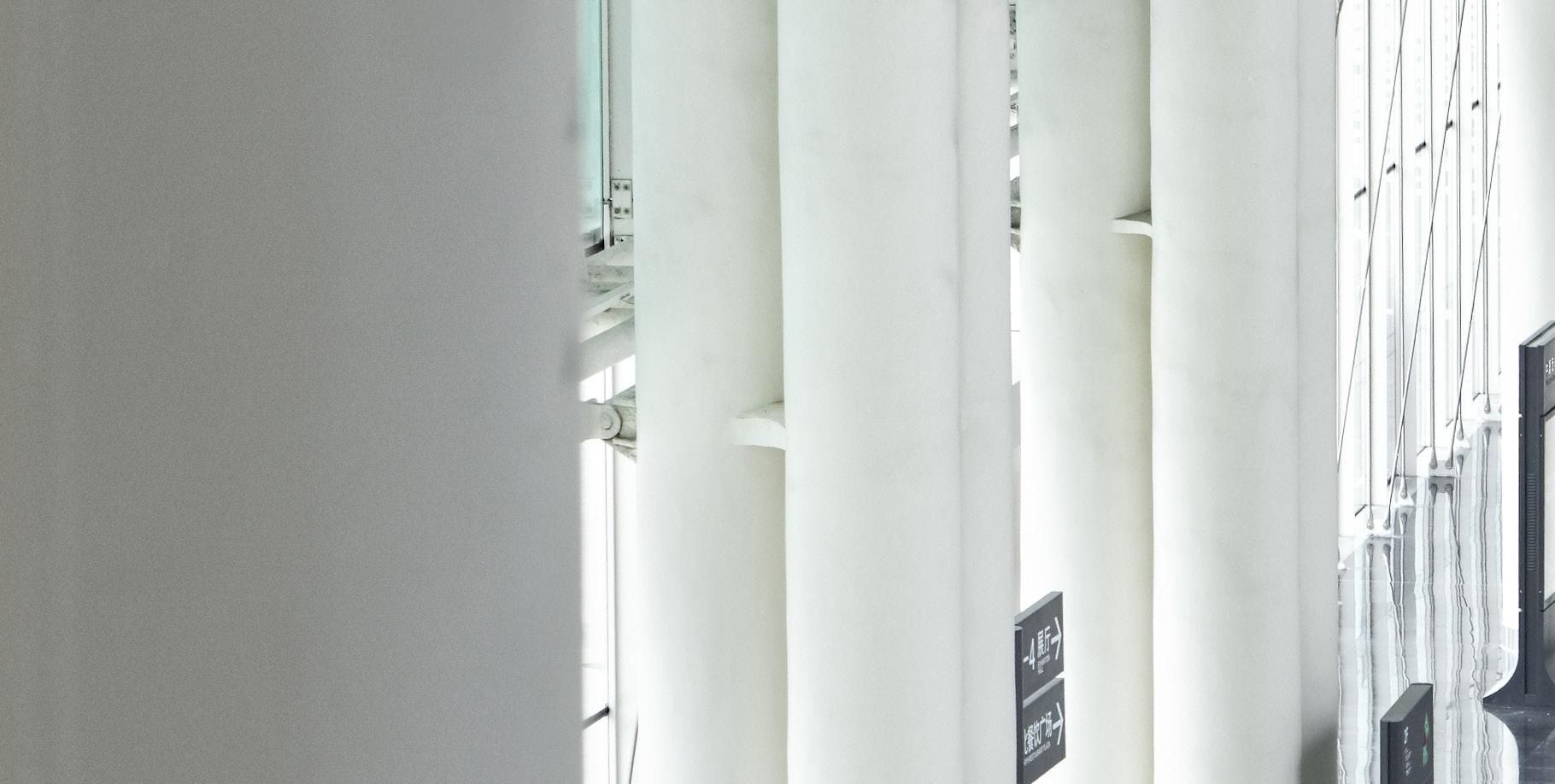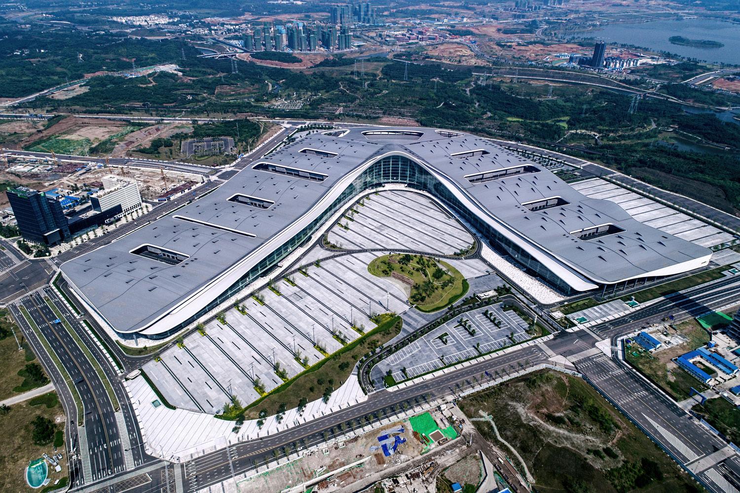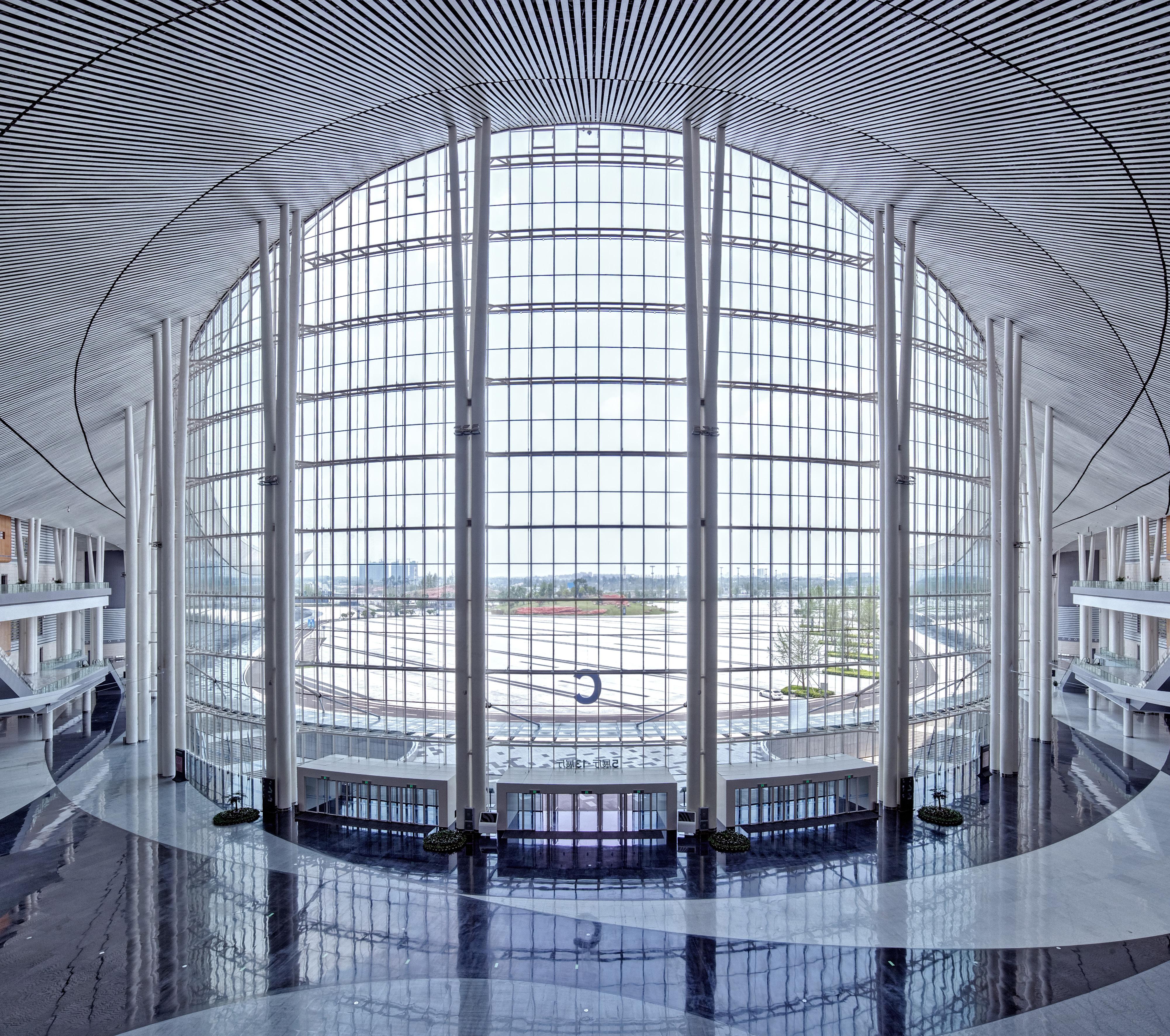 As established by the master plan for the Expo City, the exhibit halls are organized into eight halls arranged in a V formation, embracing an expansive plaza that opens toward the Tianfu Central Park to the northwest. Each typical hall is organized around a service court and is divisible into two smaller halls.