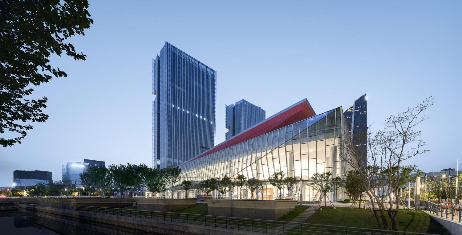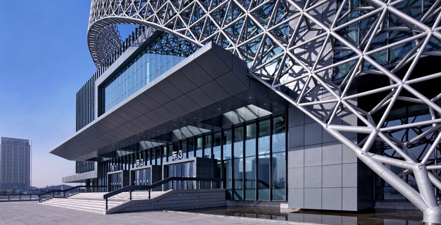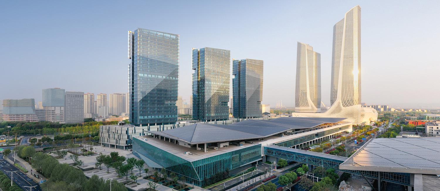 The Phase III Expansion of the Nanjing International Exposition Center is the culmination of the ongoing convention district development since the first phase opened in 2008. The 8.2 hectare Phase III site is located at the south side of the Phase I across Jinsha River West Road and offers a dramatic grand lobby on Jiang Dong Avenue. A secondary lobby serves the recently completed development to the west of the site designed by Zaha Hadid. This new expansion totals 236,000 sm and features a 50,000 sm exhibition hall and a 14,600 sm merchandise mart as program complements to the original Phase I campus. Separated from the exhibition hall by a pedestrian laneway are three high rise office/hotel towers atop a podium with 21,200 sm of retail and entertainment venues.