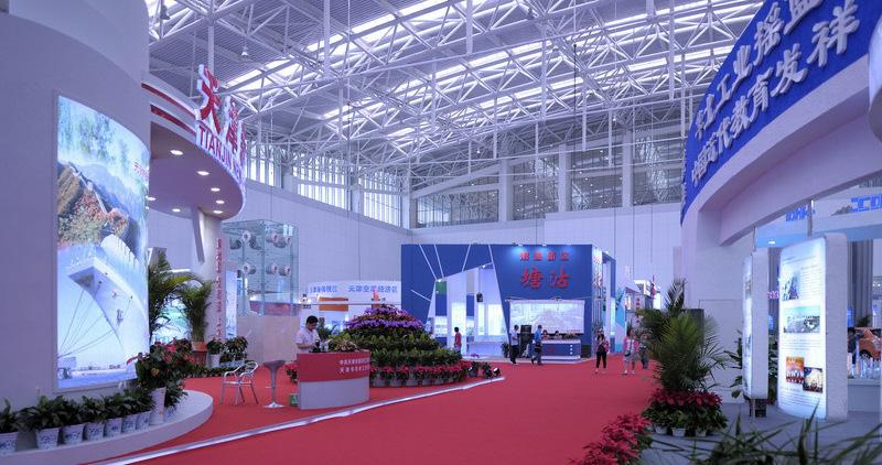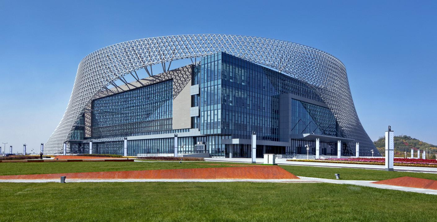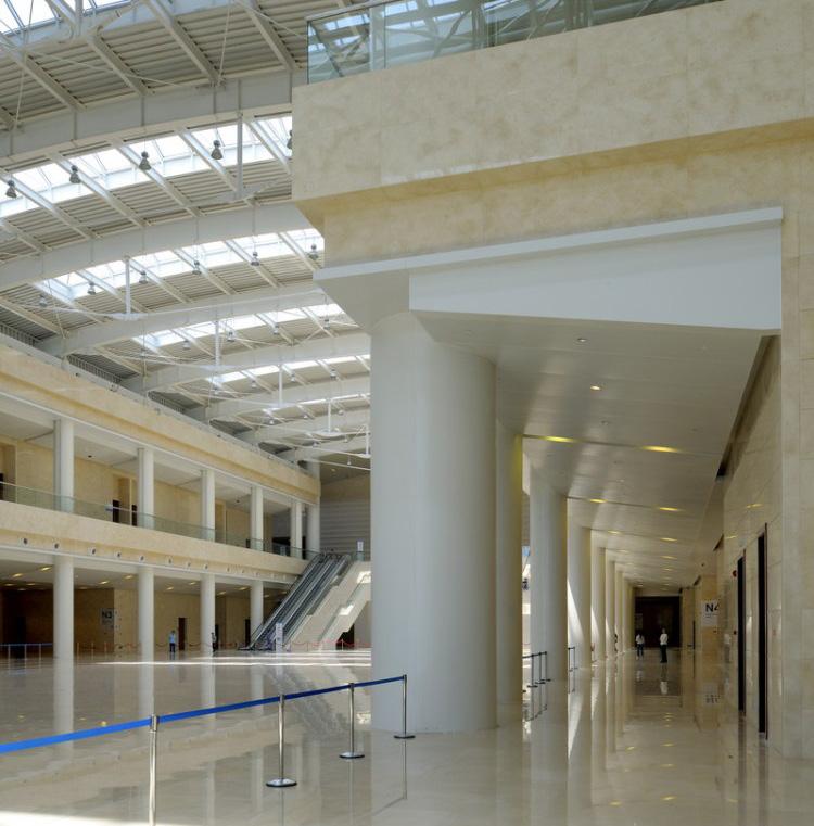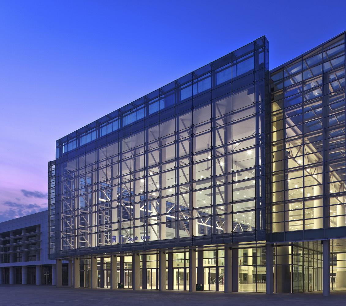 The primary components of the exhibition center are the exhibit halls for temporary exhibit events; the support and circulation spaces associated with them; the merchandise mart, a multifloor structure with showroom space for permanent exhibits; an outdoor exhibit plaza; an opening ceremony plaza on the south side; and underground parking with 3,500 spaces.