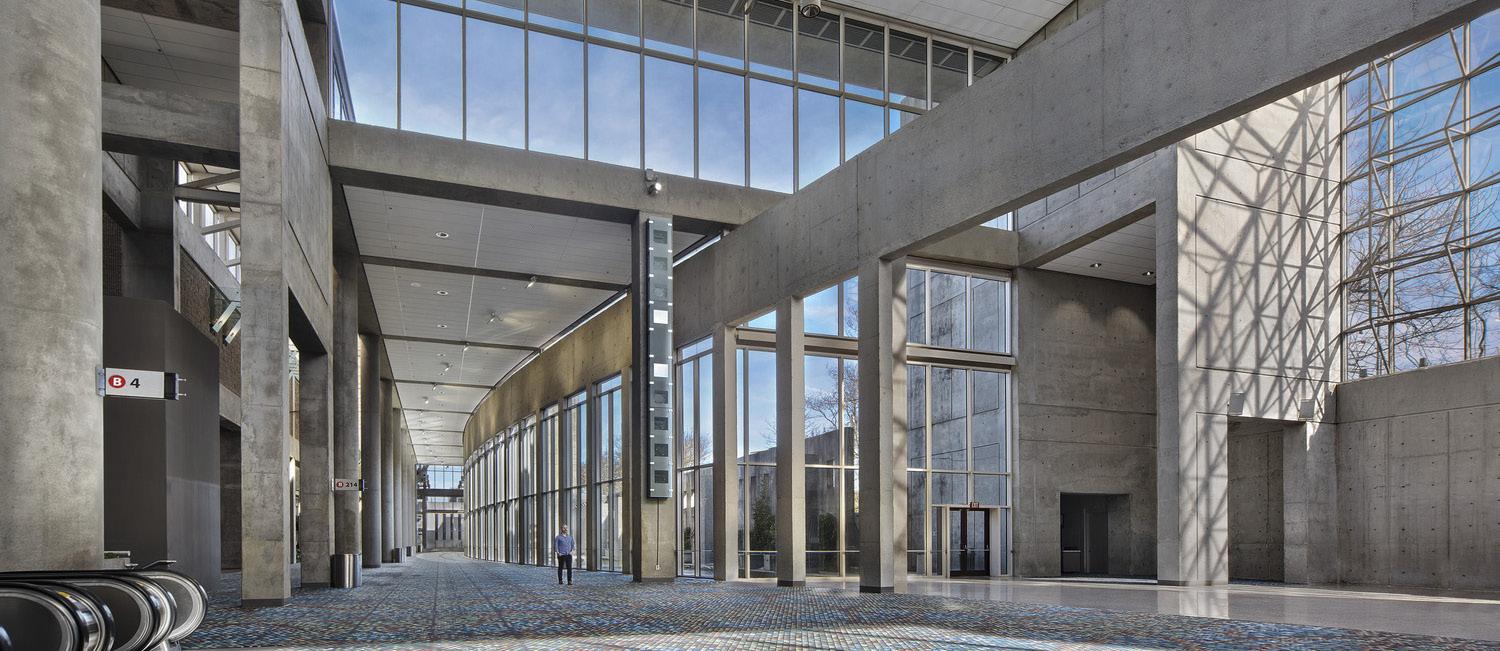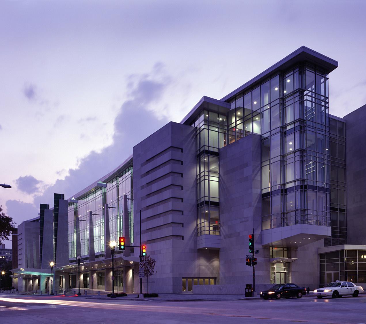 While the architecture is modernistic on a monumental scale, the grand entry atrium façade opposite The Carnegie Library is a fitting invitation to a new national meeting place. Generous fenestration and placement of concourses, registration areas, and lobbies around the perimeter reveal the activity inside to the streets outside. As Washington DC’s largest building, the center reestablished the city’s place in the meetings and convention industry, and has created new economic opportunity for the surrounding neighborhood. The center has received the prestigious American Institute of Architects (AIA) Design Award for Architecture and the Urban Land Institute’s 2006 Award of Excellence.