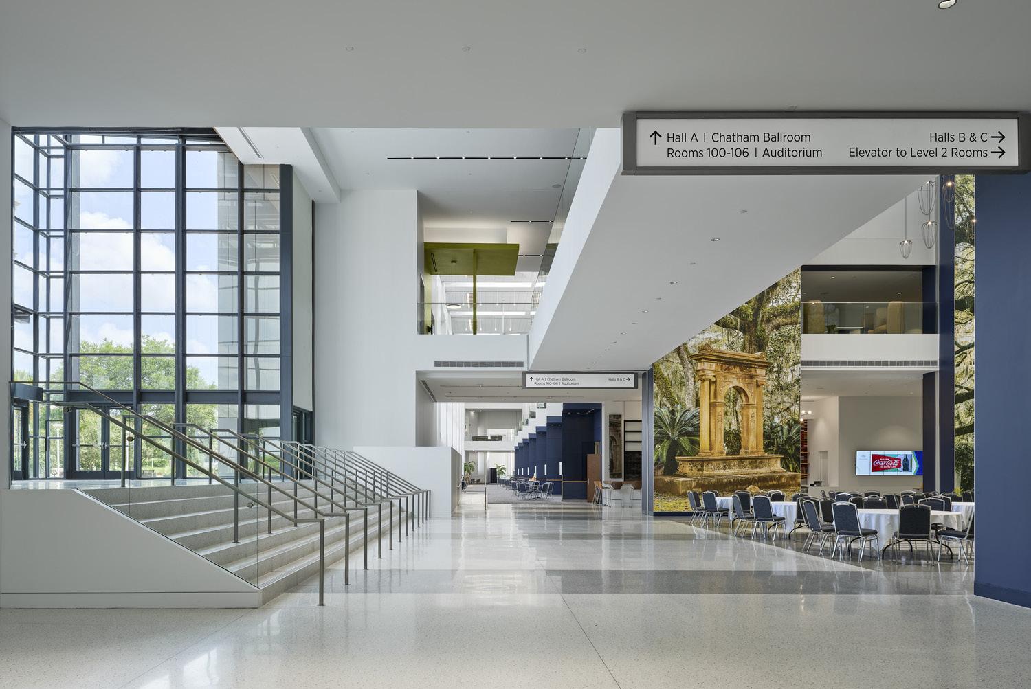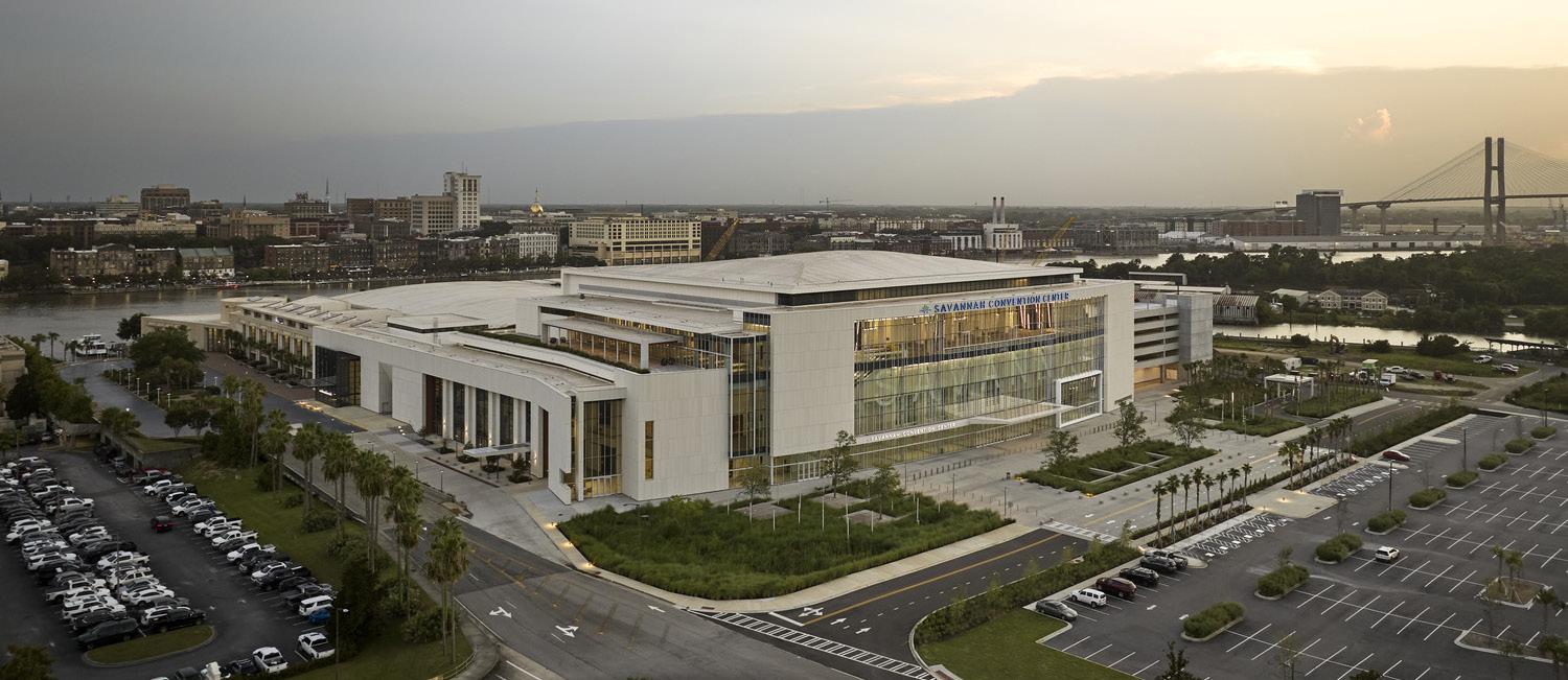 The Savannah Convention Center is located on Hutchinson Island across the river from the downtown Savannah Historic Landmark District. The existing facility opened in 2000 with 100,000 sf of exhibit space, 13 meeting rooms, a 25,000 sf ballroom, 367 seat auditorium and four boardrooms. The SCC is experiencing growth in the convention market. To facilitate this growth and continue to be competitive in the market, they are expanding their facility by doubling the size of the existing center.