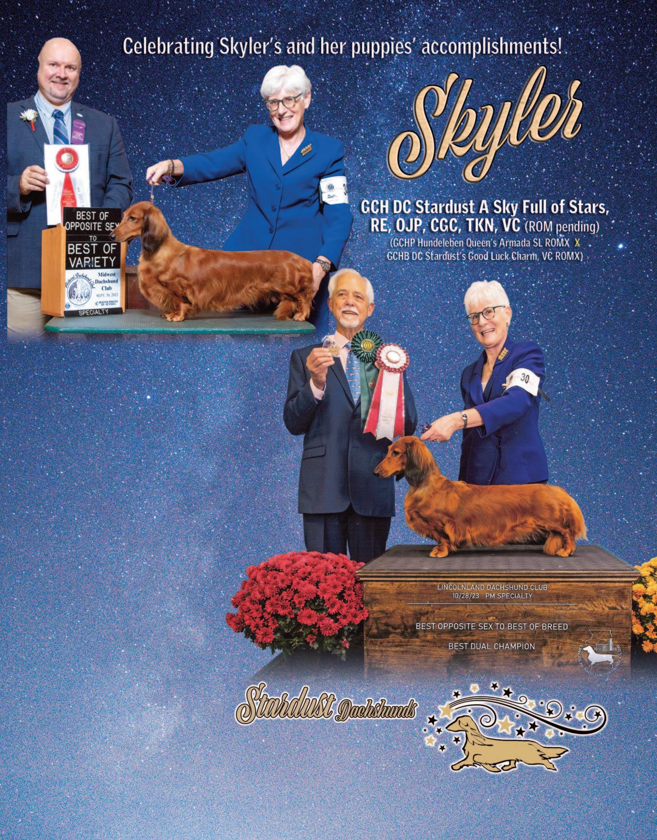 A dual champion was my original dream for my new puppy, little did I know what he had planned for me. Prince’s sire and dam are both Grand Champion Dual Champions and that’s exactly how I chose our first goals. The goals changed a little along the way as I learned more about what dachshunds are capable of. I met so many inspiring people and their dachshunds along the way. I can’t remember exactly when I learned what a Triple Champion was, but I knew I needed to make that MY lifetime goal, and I was happy that my little Prince would be just the one to do it alongside me. Page 28