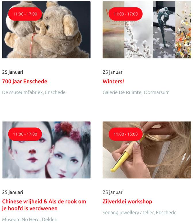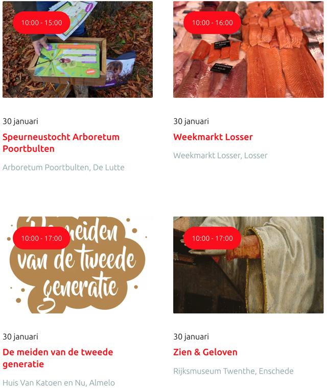 Voor een actueel overzicht kijk op: www.visittwente.nl/uitagenda of www.uittwente.nl. Evenementen en activiteiten aanmelden kan via de plaatselijke VVV/Tourist Info en redactie@twentejournaal.nl