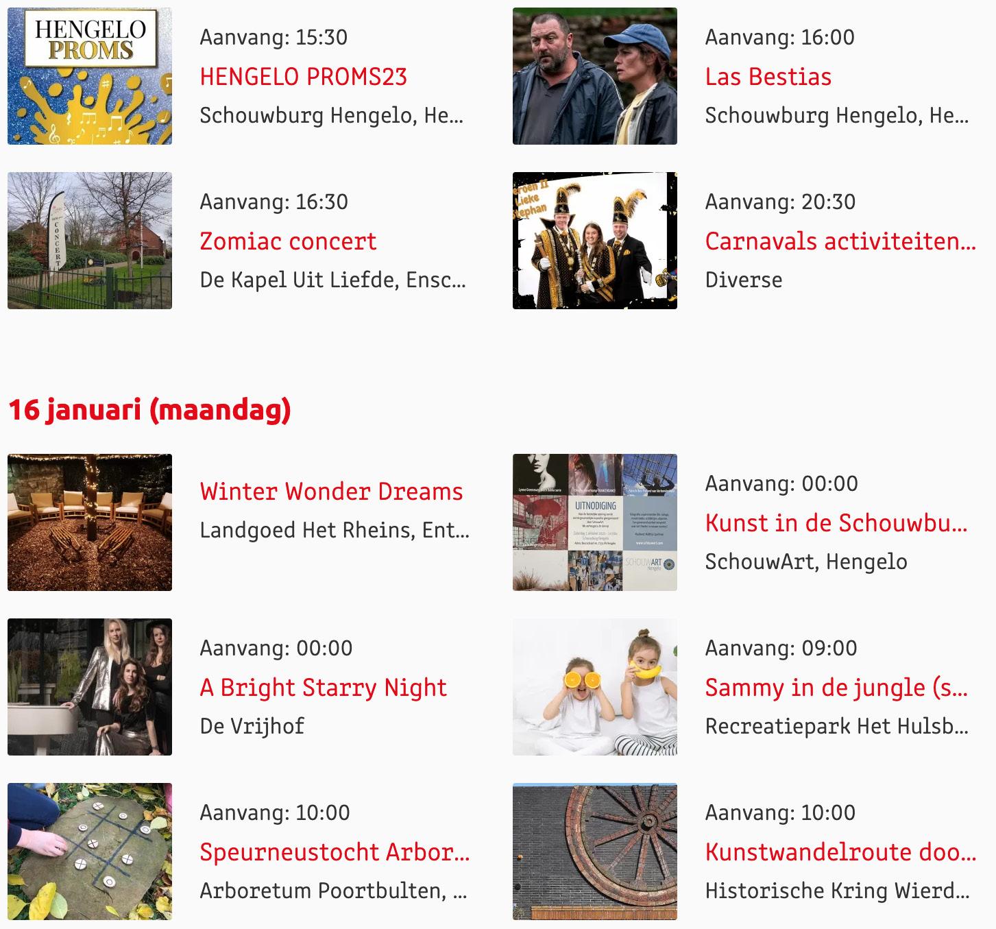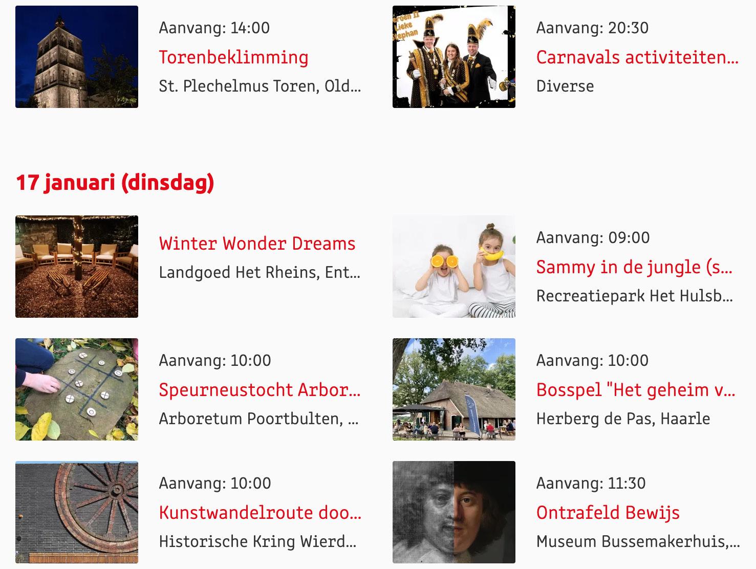 Voor een actueel overzicht kijk op: www.visittwente.nl/uitagenda of www.uittwente.nl. Evenementen en activiteiten aanmelden kan via de plaatselijke VVV/Tourist Info en redactie@twentejournaal.nl