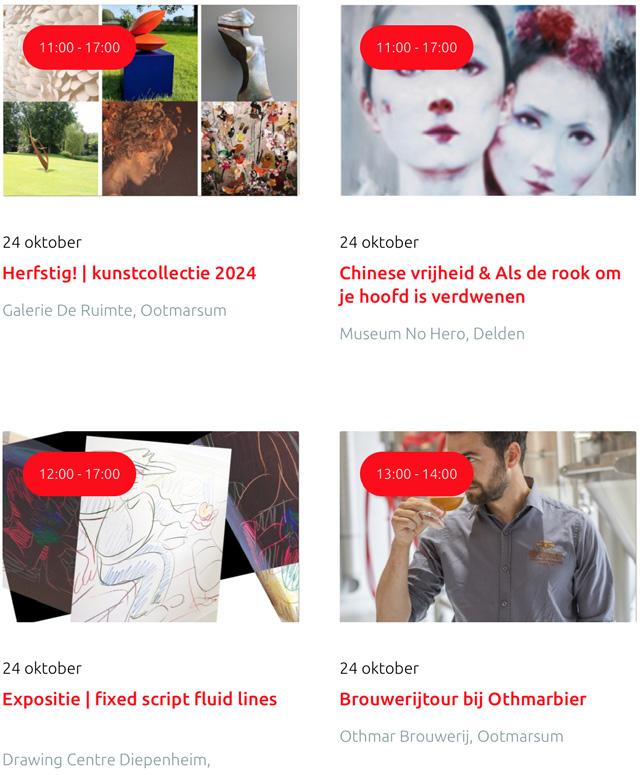 Voor een actueel overzicht kijk op: www.visittwente.nl/uitagenda of www.uittwente.nl. Evenementen en activiteiten aanmelden kan via de plaatselijke VVV/Tourist Info en redactie@twentejournaal.nl