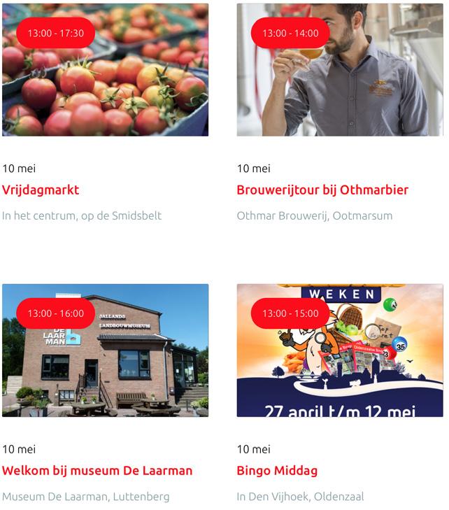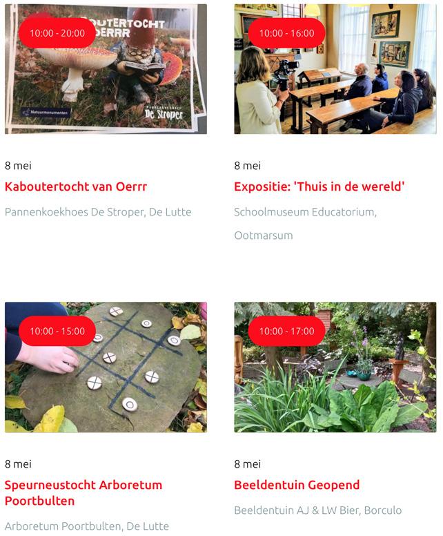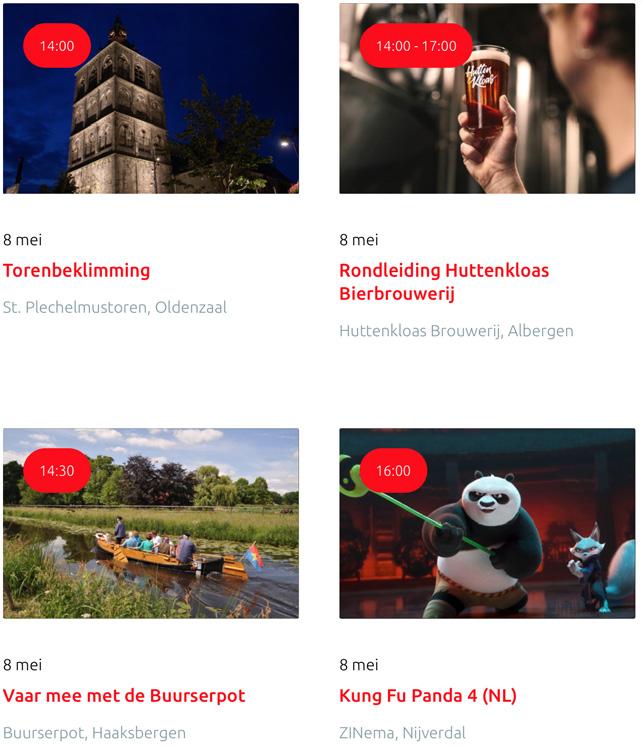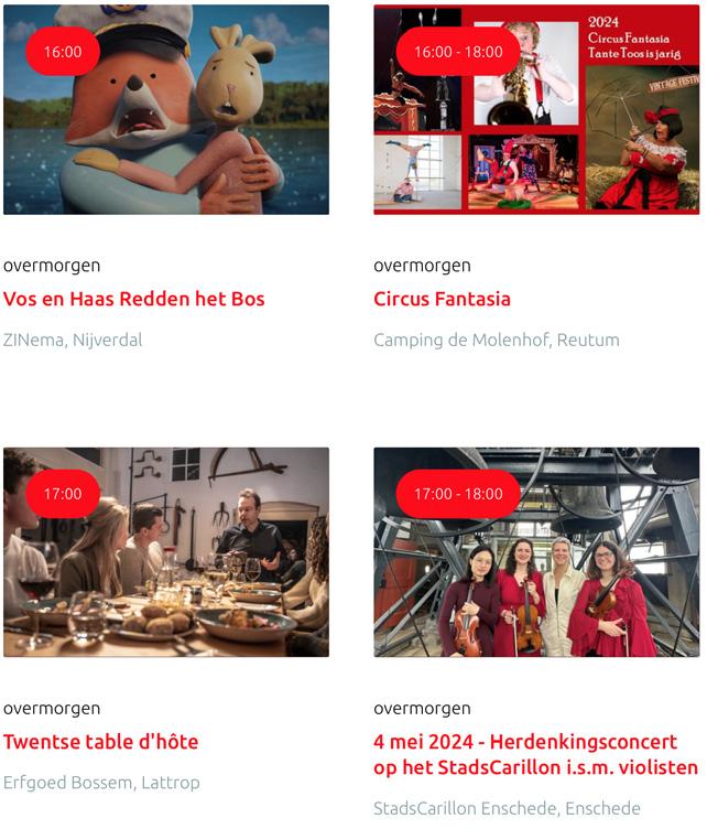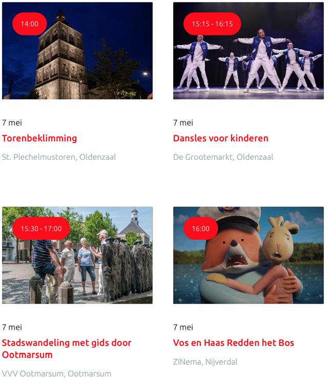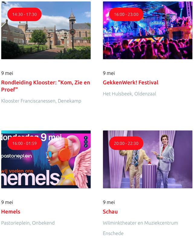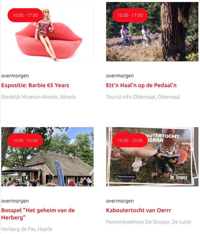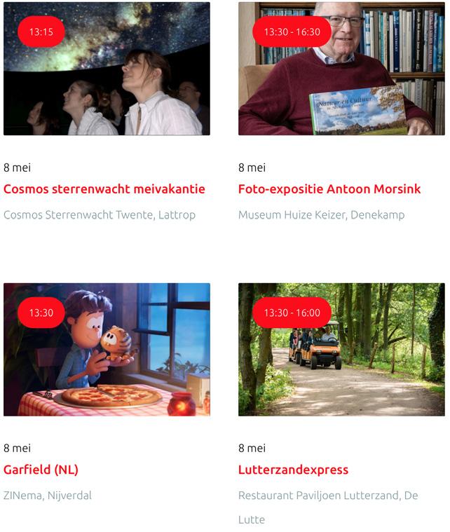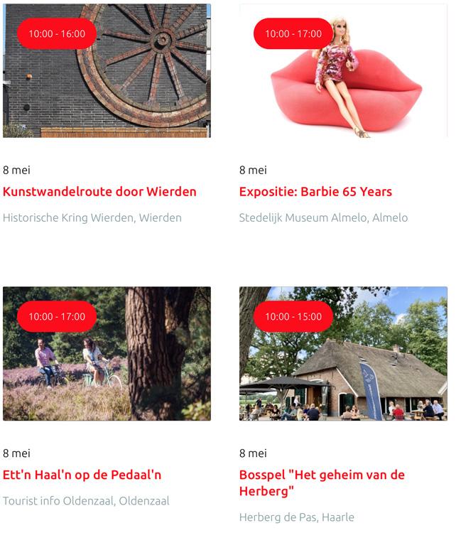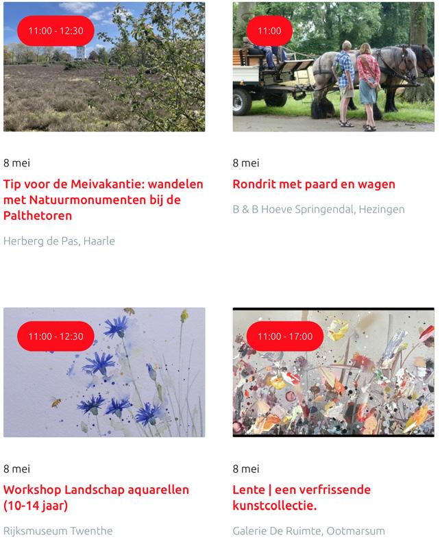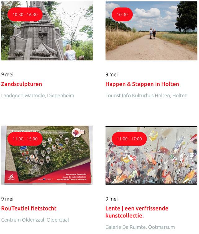 Voor een actueel overzicht kijk op: www.visittwente.nl/uitagenda of www.uittwente.nl. Evenementen en activiteiten aanmelden kan via de plaatselijke VVV/Tourist Info en redactie@twentejournaal.nl