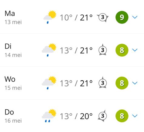 Morgenmiddag neemt vanuit het zuiden de buienkans verder toe. Bij deze is ook kans op onweer. Het blijft op de meeste plaatsen tot de avond droog. Het wordt 16 tot 18 graden. Tijdens een stevige bui zakt het kwik naar een graad of 11. De wind is zwak of matig en waait veelal uit zuidelijke richtingen. Rondom buien is de wind vlagerig.