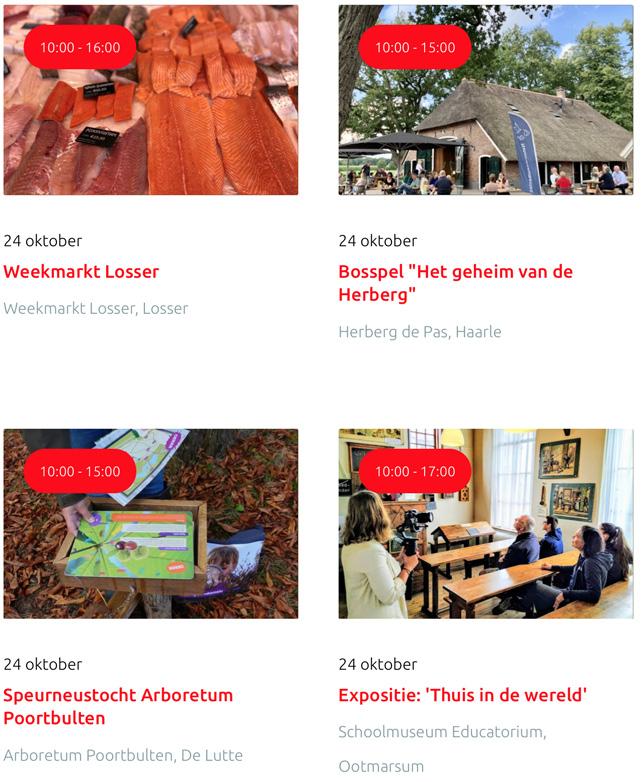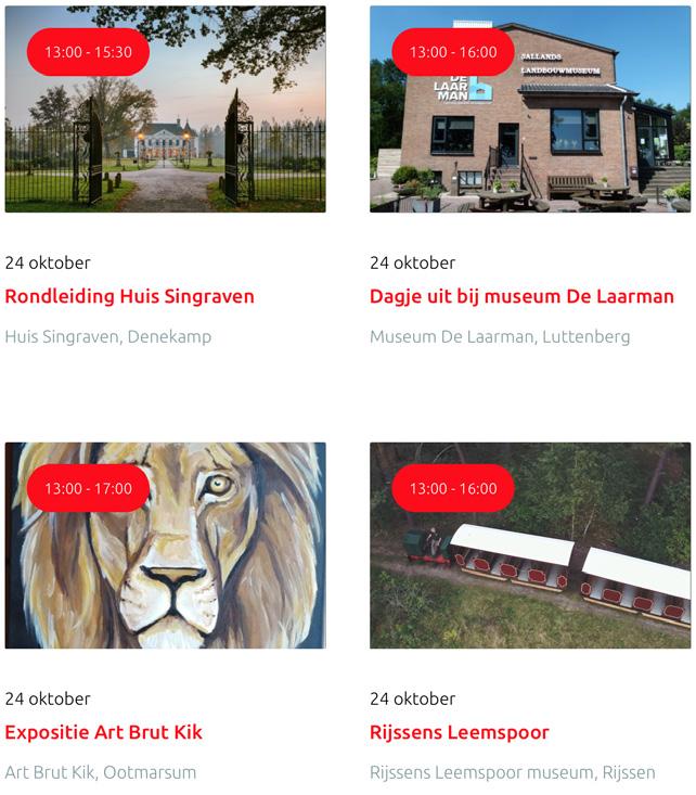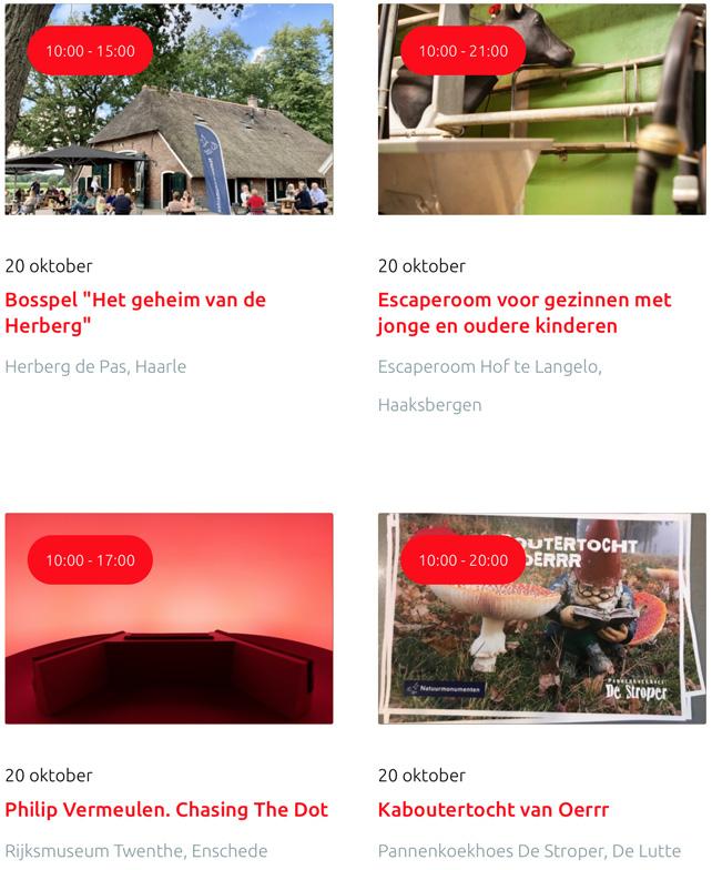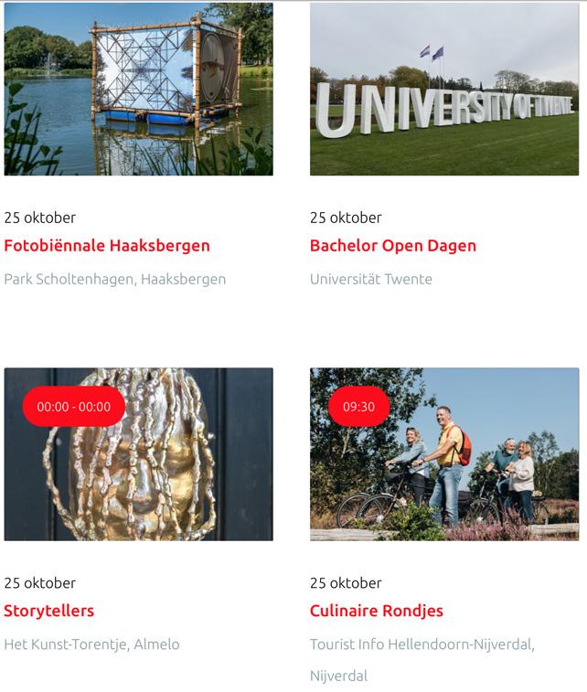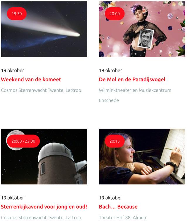 Voor een actueel overzicht kijk op: www.visittwente.nl/uitagenda of www.uittwente.nl. Evenementen en activiteiten aanmelden kan via de plaatselijke VVV/Tourist Info en redactie@twentejournaal.nl