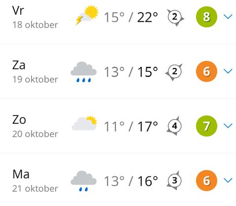De dagen daarna neemt de regen af en blijft het vaker droog met wolkenvelden en zonnige perioden. De middagtemperatuur daalt naar 14 tot 16 graden en voor de tijd van het jaar zijn dit vrij normale waarden.