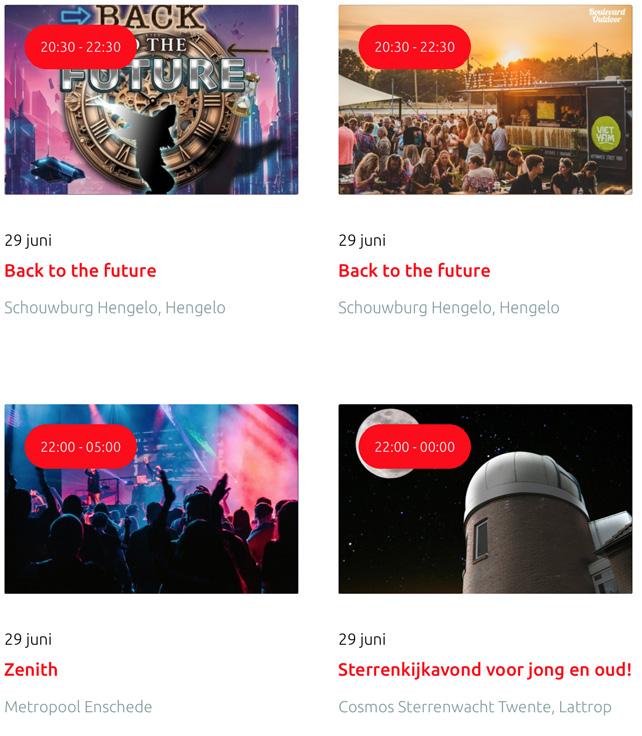 Voor een actueel overzicht kijk op: www.visittwente.nl/uitagenda of www.uittwente.nl. Evenementen en activiteiten aanmelden kan via de plaatselijke VVV/Tourist Info en redactie@twentejournaal.nl