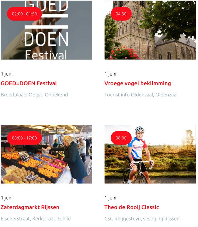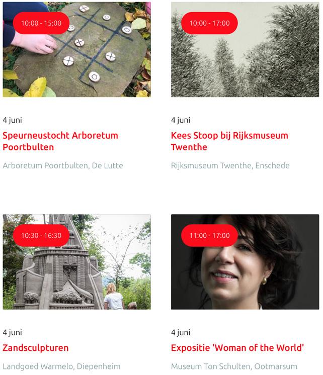 Voor een actueel overzicht kijk op: www.visittwente.nl/uitagenda of www.uittwente.nl. Evenementen en activiteiten aanmelden kan via de plaatselijke VVV/Tourist Info en redactie@twentejournaal.nl