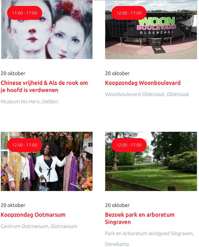 Voor een actueel overzicht kijk op: www.visittwente.nl/uitagenda of www.uittwente.nl. Evenementen en activiteiten aanmelden kan via de plaatselijke VVV/Tourist Info en redactie@twentejournaal.nl