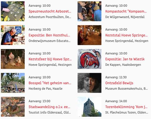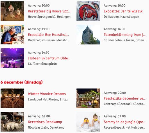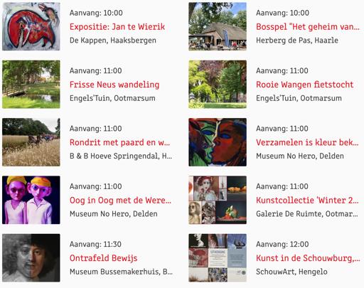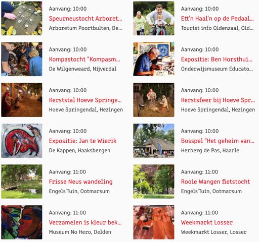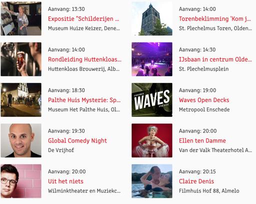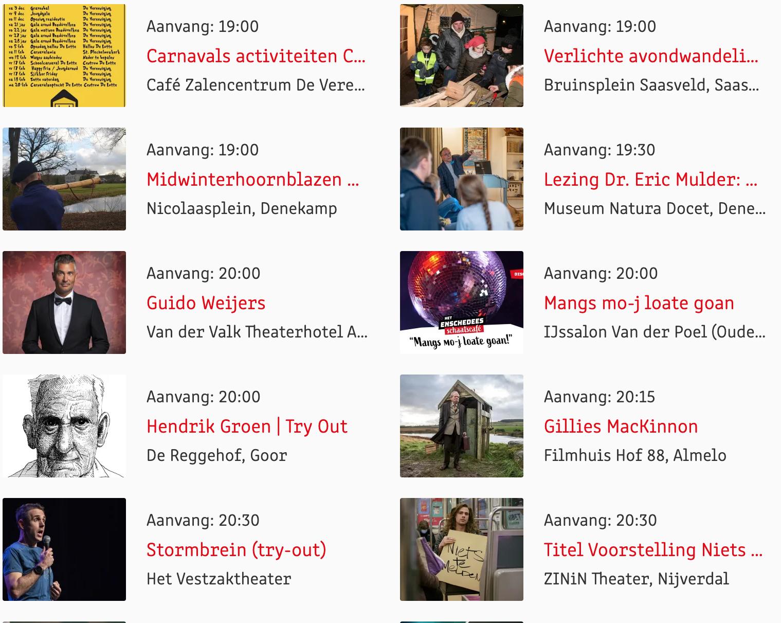 Voor een actueel overzicht kik op: www.visittwente.nl/uitagenda of www.uittwente.nl. Evenementen en activiteiten aanmelden kan via de plaatselike VVV/Tourist Info en redactie@twentejournaal.nl
