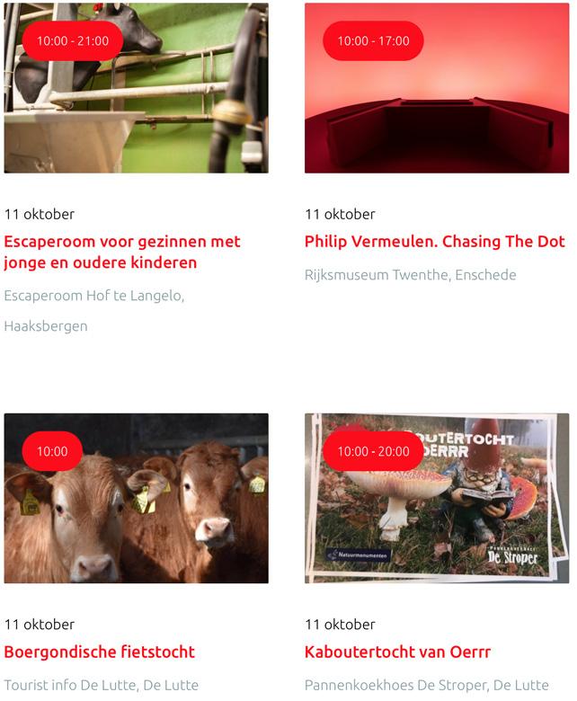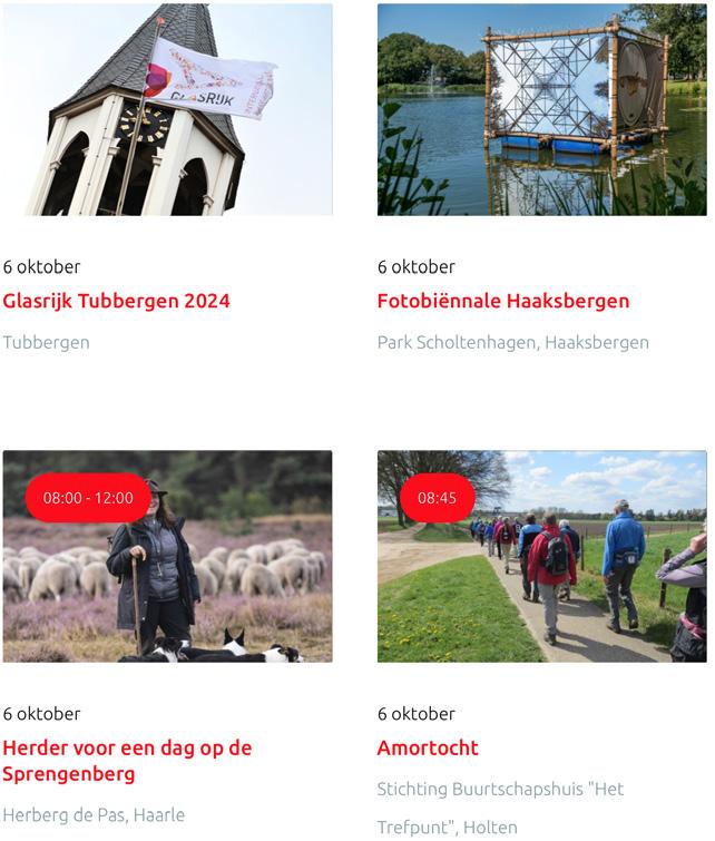Voor een actueel overzicht kijk op: www.visittwente.nl/uitagenda of www.uittwente.nl. Evenementen en activiteiten aanmelden kan via de plaatselijke VVV/Tourist Info en redactie@twentejournaal.nl
