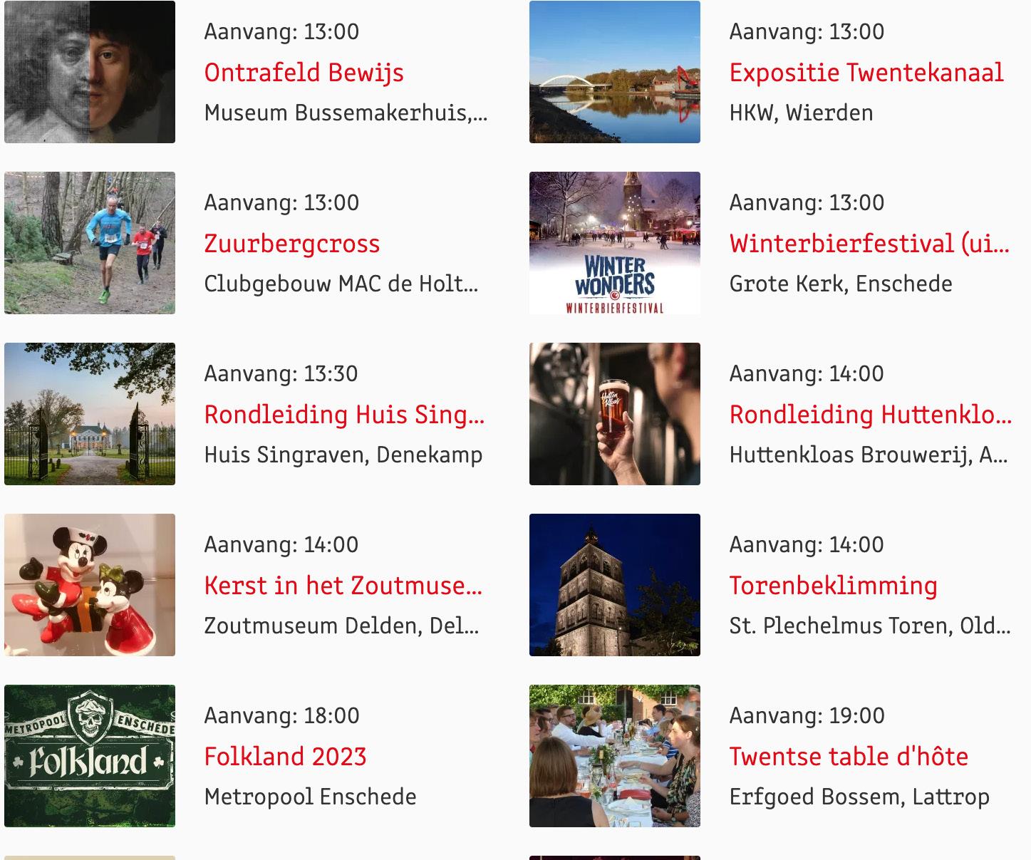 Voor een actueel overzicht kijk op: www.visittwente.nl/uitagenda of www.uittwente.nl. Evenementen en activiteiten aanmelden kan via de plaatselijke VVV/Tourist Info en redactie@twentejournaal.nl