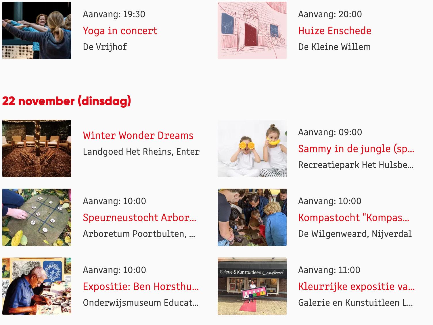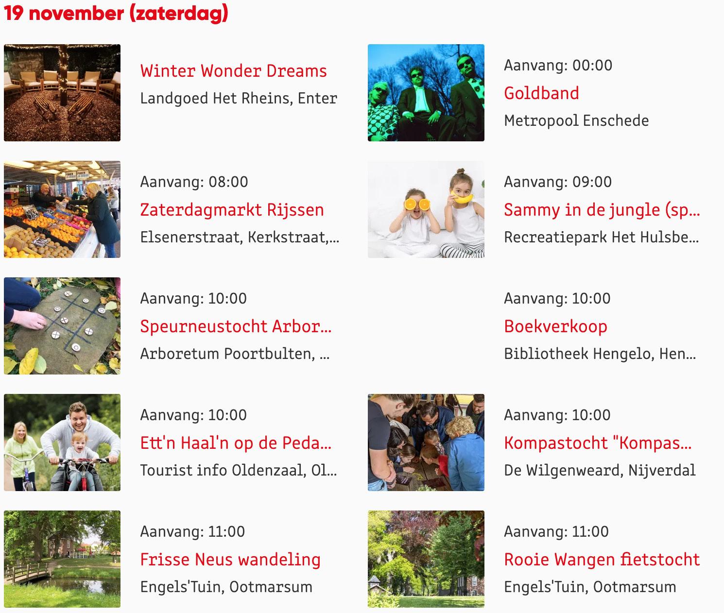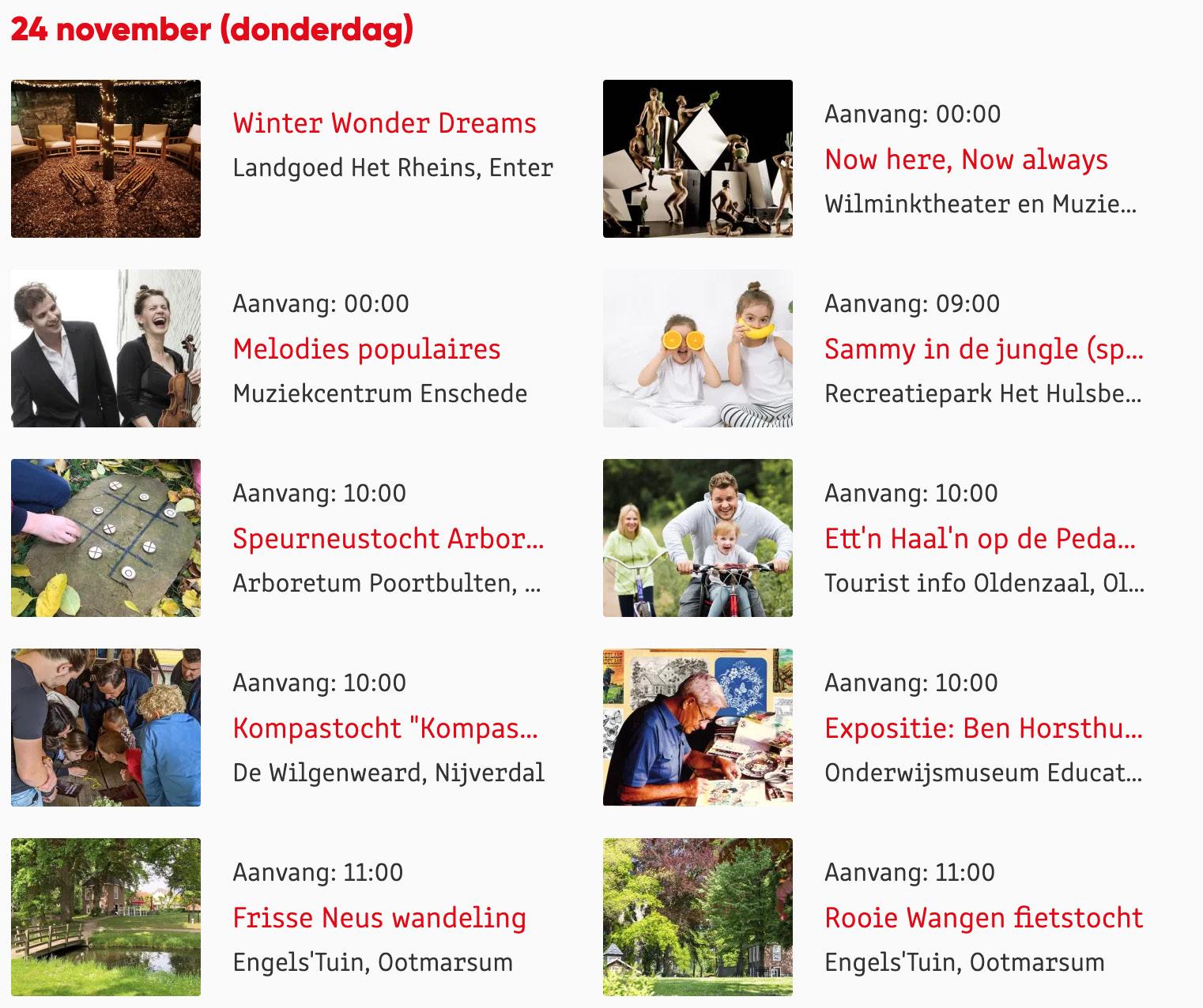 Voor een actueel overzicht kijk op: www.visittwente.nl/uitagenda of www.uittwente.nl. Evenementen en activiteiten aanmelden kan via de plaatselijke VVV/Tourist Info en redactie@twentejournaal.nl