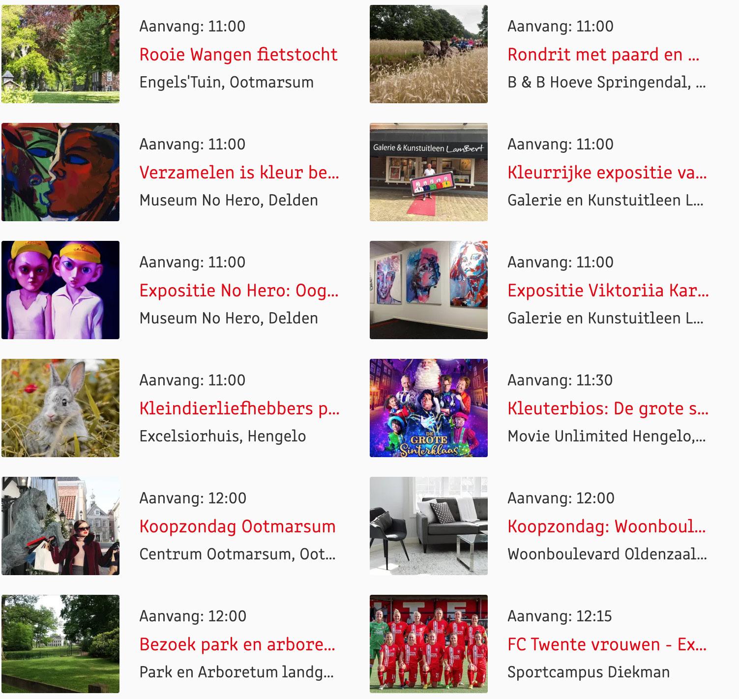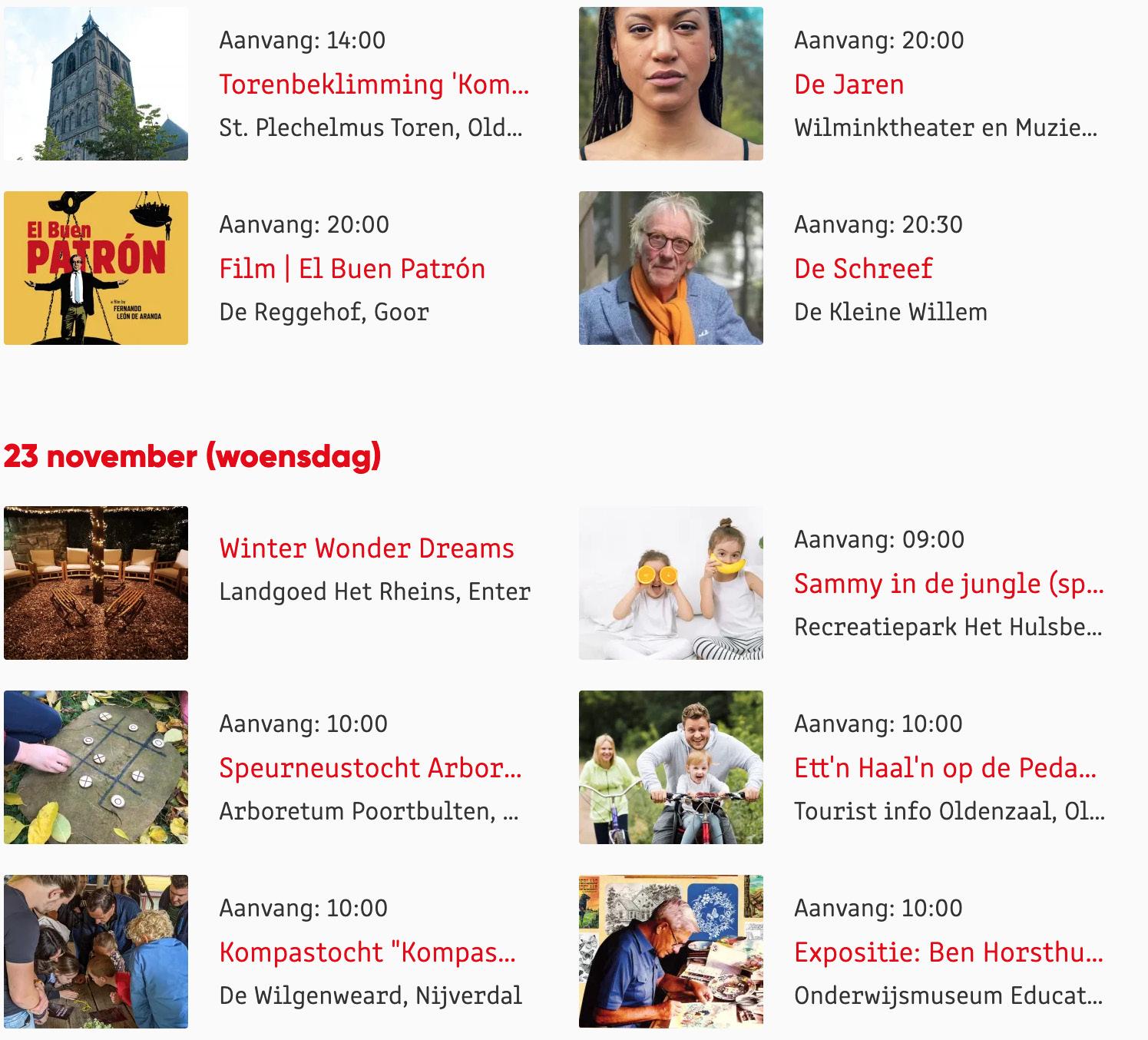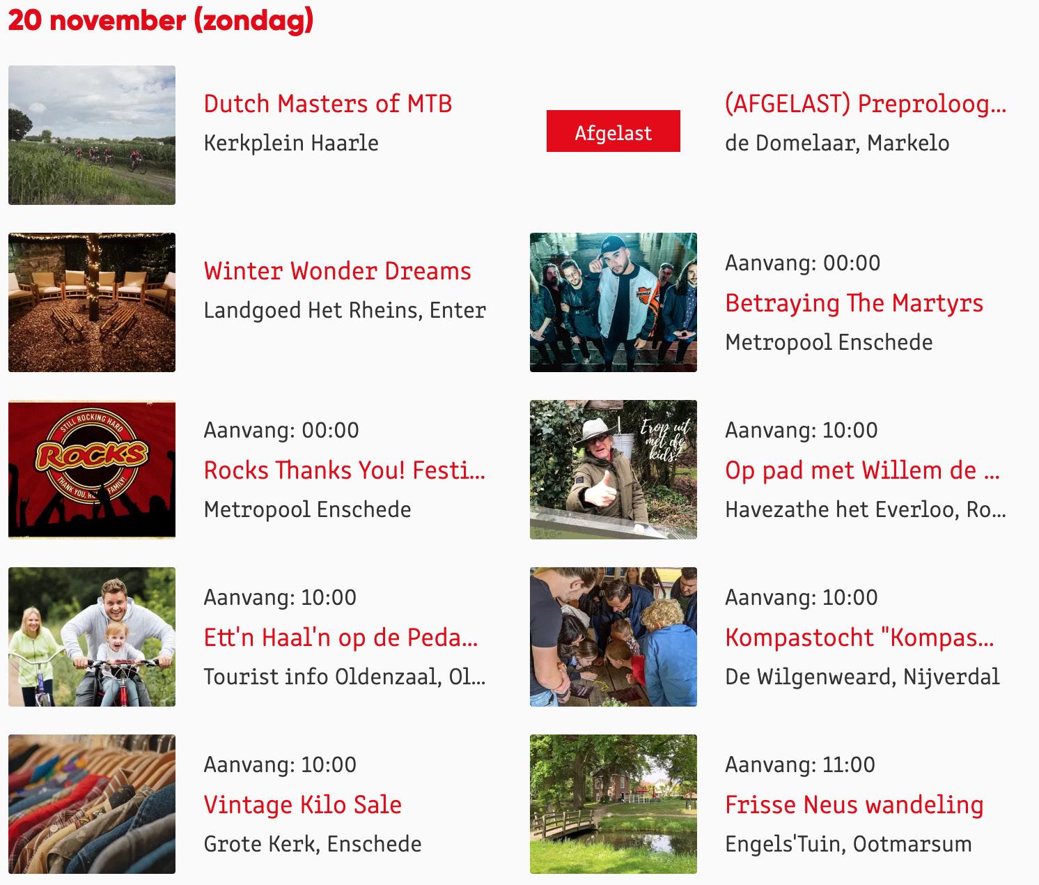 Voor een actueel overzicht kijk op: www.visittwente.nl/uitagenda of www.uittwente.nl. Evenementen en activiteiten aanmelden kan via de plaatselijke VVV/Tourist Info en redactie@twentejournaal.nl