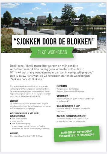 Vanaf 23 november wordt er elke woensdagochtend gewandeld door de wijk De Blokken. De wandeling wordt georganiseerd door de werkgroep ‘Meer Bewegen’ van het Lokaal Preventieakkoord ‘Vitaal Hel lendoorn’. Hierin werken de volgende partijen samen: Huisartsen ZorgSaam, Fysiotherapie ZorgSaam, De Haere, Fysio Centrum Nijverdal, Het Ravijn, De Welle en Fysio Sterk. De start van de wandeling is om 9.00 uur bij het wijkgebouw De Blokkendoos. Na de wandeling is er koffie in het wijkgebouw. Wandel jij ook gezellig mee? Vooraf aanmelden is niet nodig.