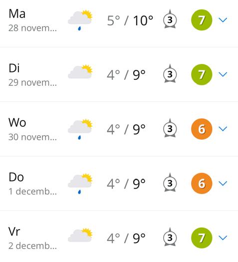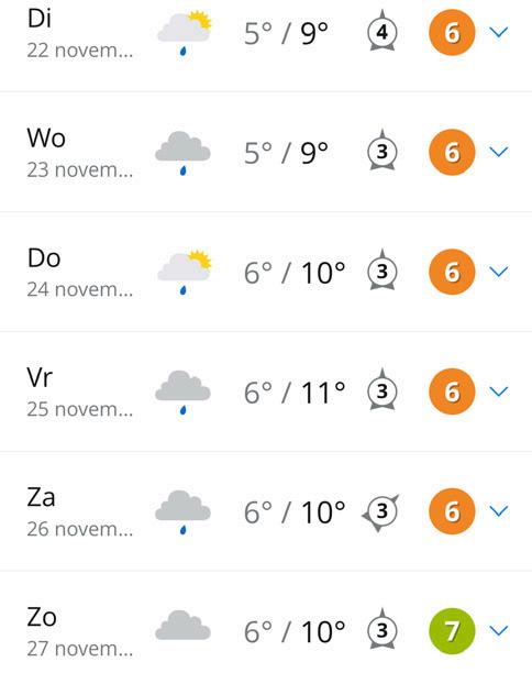 De dagen daarna blijft het herfstachtig met dagelijks kans op regen. De middagtempera tuur stijgt licht met later in de week 9 tot 11 graden.