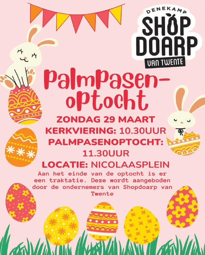 In Denekamp wordt op zondag 29 maart weer de jaarlijkse Palmpaasoptocht gehouden. De optocht is een geliefde traditie in het dorp en brengt ieder jaar veel kinderen, ouders en andere belangstellenden samen in de aanloop naar Pasen.