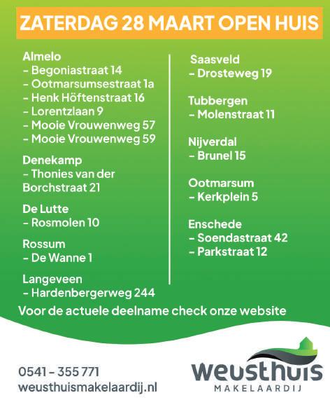 Elke woensdag en donderdag in Denekamp, Ootmarsum, Tilligte, Lattrop, Noord Deurningen, Beuningen, Groot Agelo, Breklenkamp, Weerselo, Saasveld, Deurningen en Rossum.