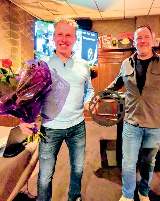Raymond Timmerhuis werd voor zijn verdiensten voor de club gehuldigd. Hij zet zich al jaren in voor de MTBmateriaalcommissie, biedt ruimte voor opslag van materiaal, is actief bij het onderhoud van de vaste route en is daarnaast ook nog acht jaar bestuurslid geweest. Reden genoeg om hem in het zonnetje te zetten met bloemen en een blijvend aandenken.