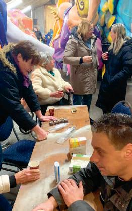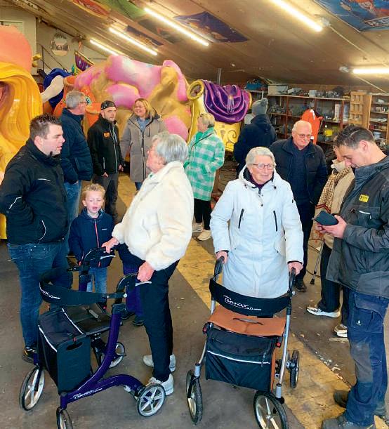 • In een andere loods werkten jongeren en ouderen zij aan zij aan de carnavalswagen: plakken, knippen, schilderen – met zichtbaar plezier en toewijding.