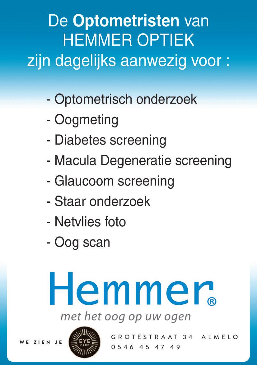 Het oogonderzoek bij Hemmer Optiek & Opto‐metrie gebeurt zeer zorgvuldig. Daarbij wordt gebruik gemaakt van de modernste apparatuur. Onderzoek wordt onder meer gedaan naar macula degeneratie, diabetes, staar, droge ogen en het netvlies. Ook de samenwerking tussen de ogen wordt onderzocht. Als in de familie bepaalde ziektes voorkomen, wordt altijd een preventief oogonderzoek gedaan.