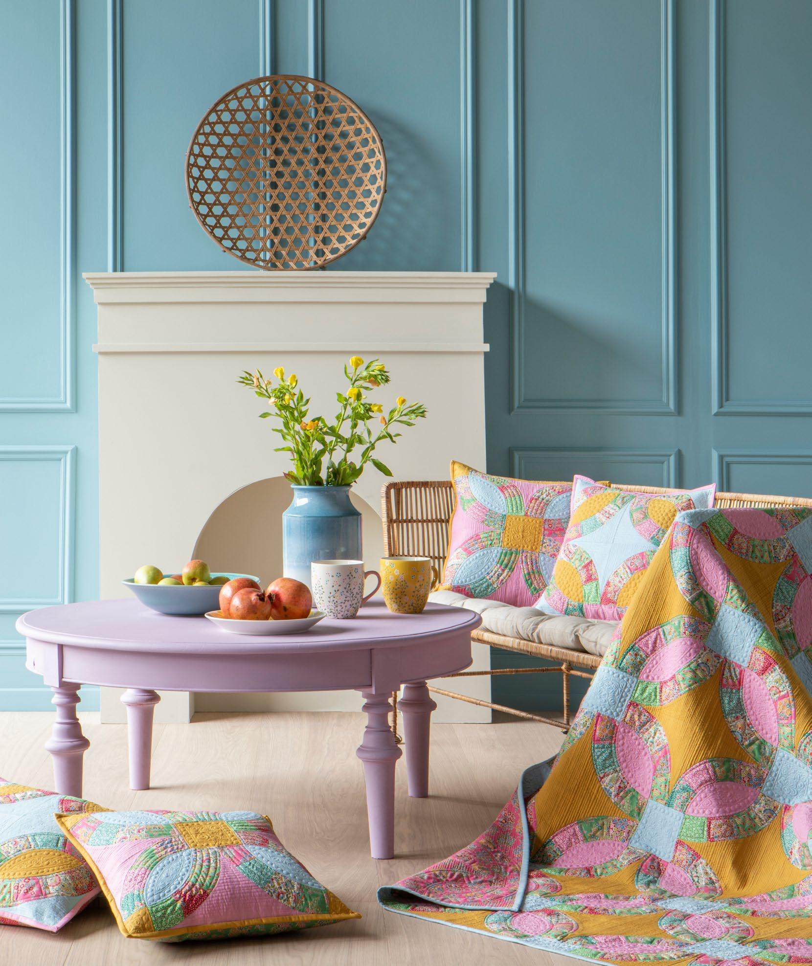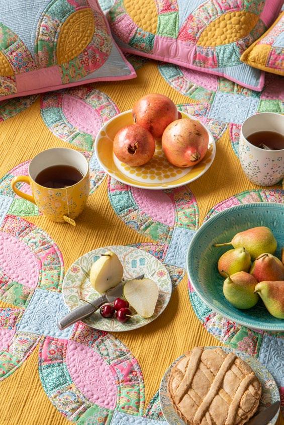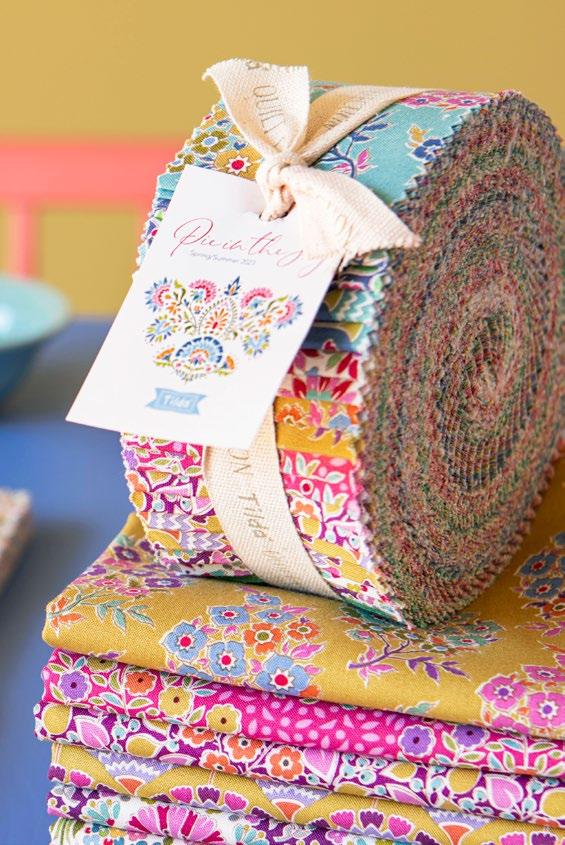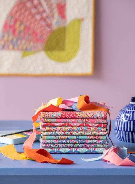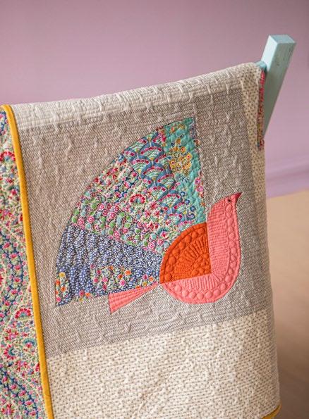 The picture feature Fan Bird Quilt, Forever Yours Quilt Dusty Teal and Pie in the Sky frabrics. All the projects featured in this catalogue are available as free patterns on tildasworld.com.