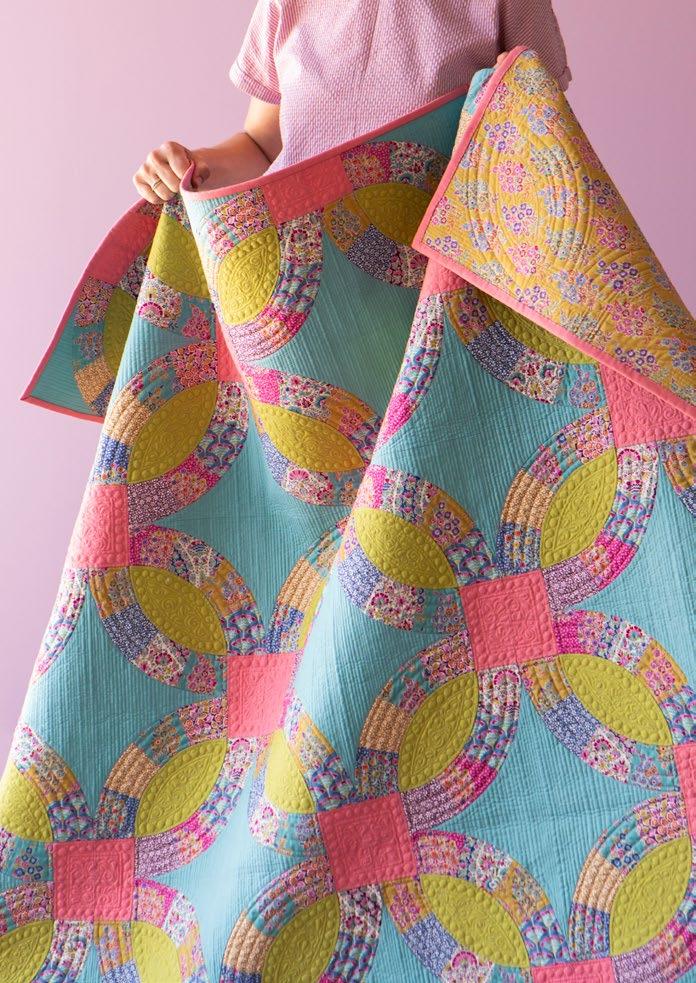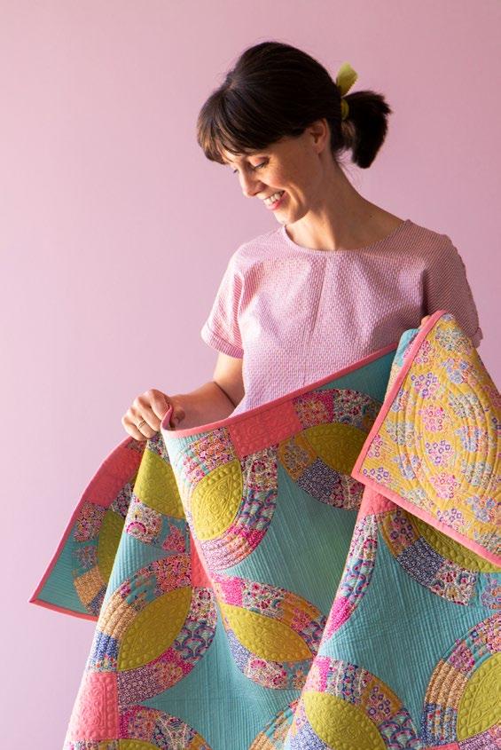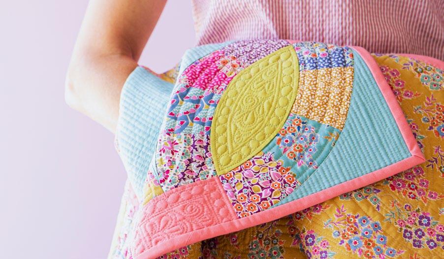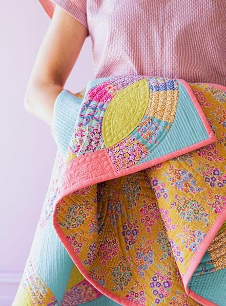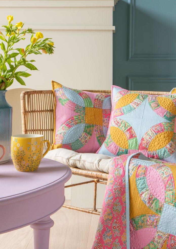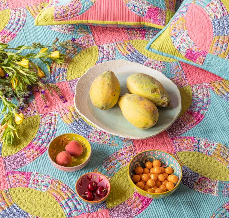 The Pie in the Sky collection is a fresh array of fabrics for spring and summer, with doodle-like flowers giving the designs a naive and effortless feel. The sweet motives and colors have a vintage look that was the point of departure for several quilt designs. Fun fabric names like WillyNilly, Whimsybird, TopsyTurvy and Cloudpie invite you to indulge in a happy, creative sewing escape. The projects created with this collection take inspiration from well-known vintage quilt designes such as “double wedding band” and “fan”