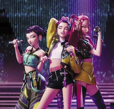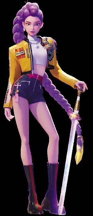 Sisters, who taught her during childhood to hide her demonic heritage, and that by fulfilling her purpose of sealing the Golden Honmoon, her patterns would disappear. Throughout the film, Rumi struggles with her dual heritage, concealing her markings and fearing rejection from both her team members and her fan base. In the English dub, Rumi is voiced by Arden Cho, with EJAE providing her singing vocals, while Shin Na-ri voices her in the Korean dub. Rumi’s signature feature is her long, brilliant purple hair, typically styled in a thick dragon tail braid that reaches down to her calves. This was her hair style even as a child in flashbacks. Though her skin is normally pale, she also inherits purple demon patterns that glow pink whenever she is under stress. In such moments, her irises also shift from brown to gold and her hands become clawed.