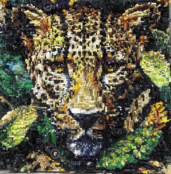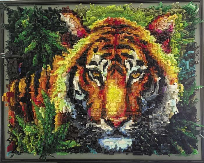 This is where the art really comes in, because I transform the 2-D image into a 3-D piece by creating miniature builds, habitats, and other “Easter eggs” hidden throughout. In Waiting for Calvin (the tiger), there are hidden scenes of a coral reef, a zombie attacking a hospital, a gem thief stealing precious stones, and a LEGO Elves goblin causing mischief. You have to view the art from all sides to catch the hidden scenes. I also try to incorporate pop culture references (like the scene from the movie Life of Pi) and meta elements (like placing Tigger and Rajah—tigers within the tiger). In the end, the 2-D plan from LEGO Art Remix is about a 70% solution and I make adjustments for the rest, particularly around the eyes that need to captivate the audience.