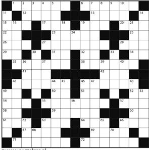 Horizontaal: 1 scherpe saus 6 grote zee 12 benzineblik 13 Griekse letter 15 Turks bevelhebber 17 olm 19 stuk grond 20 soort hert 22 slee 23 haardracht 25 de dato 26 vreemde munt 27 editie 28 afslagplaats bij golf 29 overmatig 31 kauwtje 32 bevel 34 lage rivierstand 35 startklaar 38 binnenkomst 41 opstootje 42 gehoororgaan 43 jammer 46 hoeveelheid 49 selenium 50 Militaire Politie 51 heilige 52 Oude Testament 54 blauwwit metaal 55 Europeaan 57 nageslacht 58 of dergelijke 59 meubelstuk 60 muzieknoot 61 pausennaam 63 ontastbare stof 64 hoofdgroet 66 water in Utrecht 67 toegankelijk 69 verdikte huid 71 bezoek 72 luxe scheepsreis.