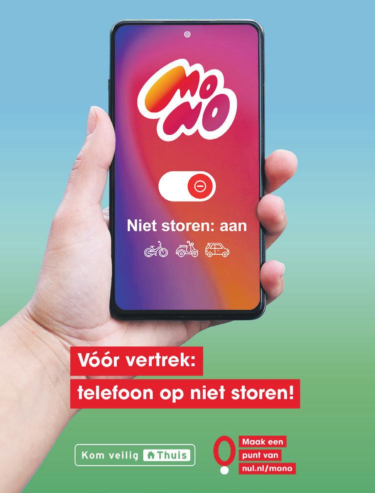 Rij daarom MONO. Dit staat voor ongestoord onderweg zijn. Met de aandacht bij het verkeer, zonder afleiding van de mobiele telefoon.