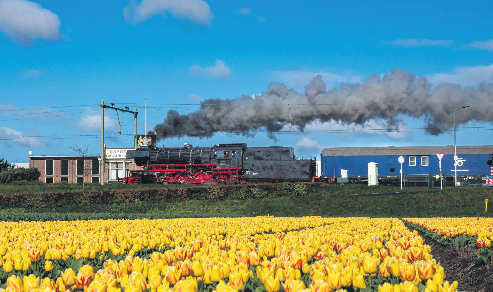 uit de naoorlogse jaren over het spoor langs de bollenvelden. Alle vijf de ritten waren stijf uitverkocht. Bij de laatste rit werd ook een vroege elektrische trein aangekoppeld. Dit nostalgische plaatje zorgde ervoor dat tientallen fotografen langs het