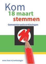 Op woensdag 18 maart zijn de gemeenteraadsverkiezingen. Dan kunt u uw stem uitbrengen voor de nieuwe gemeenteraad. De gemeenteraad bestaat uit inwoners uit Lisse, die besluiten nemen over onderwerpen als afval, verkeer, woningbouw, onderwijs en lokale belastingen. Meer weten? Kijk op www.lisse.nl/verkiezingen