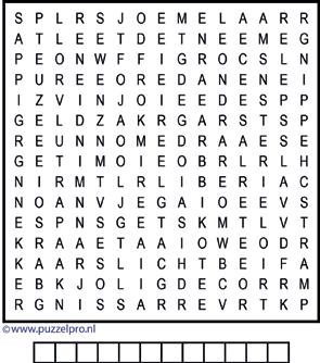 De woorden zitten horizontaal, verticaal en diagonaal in alle richtingen in de puzzel verstopt. Ze kunnen elkaar overlappen. Zoek ze op en streep ze af. De overblijvende letters vormen achter elkaar gelezen de oplossing.