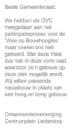 Op maandagavond 7 november be spreekt de Leiderdorpse politiek de Visie op Bouwhoogtes in het Poli tiek Forum. Voorafgaand wil de OVC in gesprek gaan met alle fracties en tijdens het Politiek Forum en de ge meenteraadsvergadering van een week later, waarin een besluit geno men wordt over de visie, zal het OVC bestuur zich duidelijk laten horen. Smit benadrukt dat naar mening van de OVC in de voorliggende Vi sie voor Bouwhoogtes wel erg veel rekening wordt gehouden met de wensen van Wereldhave en de Ci tystone Groep. “De hamvraag aan de gemeente is: wiens belang die nen jullie nu eigenlijk?”