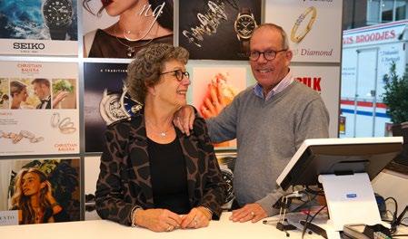 Het zal wennen worden voor Leider dorp. Juwelier de Jonge is al 53 jaar een begrip in het dorp. Het is de plek waar Leiderdorpers heen gaan om sieraden en horloges te kopen of te laten repareren, waar verliefde stel len hun trouwringen uitzoeken en waar generaties kleine meisjes gaat jes in hun oren lieten prikken. De grondlegger was Joop de Jonge, die in 1969 startte met zijn juweliers zaak in een van de kiosken die toen nog bij het winkelcentrum aan de Laan van Ouderzorg stonden. Later verhuisde de winkel naar het pand op de hoek van de Laan van Ouder zorg en de Van Diepeningenlaan. Toen Wim en Irene Gerhardt de zaak in 2004 overnamen, besloten ze de naam ‘Juwelier de Jonge’ te behou den. “Leiderdorpers waren daar al 35 jaar aan gewend, dat moet je dan niet veranderen”, legt Irene uit. Wel hebben ze er echt hun eigen zaak