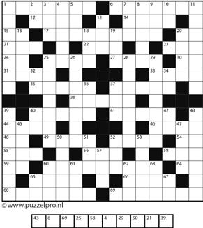 Breng letters uit de puzzel over naar de hokjes met hetzelfde nummer. Horizontaal: 1 cowboyfilm 6 veldtoilet 12 vleesstokje 14 lommerrijke weg 15 nieuwe maan 17 euvel 20 Noord-Brabant 21 scheepsvloer 22 oppervlaktemaat 23 graskluit 24 in memoriam 25 Scandinaviër 27 vuile vettige mist 30 muzieknoot 31 Scandinaviër 33 woestijnbron 35 deel v.h. oog 37 saaie gewoonte 38 tamelijk 40 langere route 41 verhaal 44 verbond 46 sneeuwvoertuig 48 British Airways 49 tentsluiting 52 staat in Amerika 54 doctor 55 vernis 56 vrouwtjesschaap 58 olm 59 ingenieur 60 deel v.e. vliegtuig 64 Frans lidwoord 65 rijstgerecht 66 roemen 68 kruiderij 69 deel v.e. bromfiets. Verticaal: 1 draai 2 stoomschip 3 niet wild 4 verdieping 5 snelle loop 7 Engels bier 8 Argentijnse dans 9 knaagdier 10 modern 11 logo 13 afgelegen 16 korte nota 18 grote beker 19 snijwerktuig 20 onvriendelijk 25 slagwerker 26 zeer goed 28 dwaas mens 29 vleesgerecht 32 voorzetsel 34 slee 36 zwaar en traag 37 kwelgeest 39 voortreffelijk 40 onzes inziens 42 Nederland 43 slang 45 heel vervelend 47 adellijk 50 Europese vrouw 51 afwaswater 52 domkop 53 snel reagerend 57 domoor 60 schaakterm 61 nageslacht 62 dakbedekking 63 opstootje 65 Nederlandse Spoorwegen 67 voorzetsel.