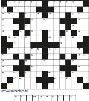 Breng letters uit de puzzel over naar de hokjes met hetzelfde nummer. Horizontaal: 1 Europese taal 6 beste prestatie 12 vulkaan op Sicilië 13 bewusteloosheid 15 loofboom 17 griezelig 19 graskluit 20 kilte 22 niet parkeren 23 nummer 25 nummer 26 schraal 27 schietvoorraad 28 achterkant v.d. hals 29 Evangelische Omroep 31 ingenieur 32 voegwoord 34 loofboom 35 vechtsport 38 helper 41 haarversteviger 42 Europeaan 43 fototoestel 46 geraamte 49 schuif 50 onder andere 51 tot afscheid 52 rooms-katholiek 54 komisch nummer 55 telwoord 57 dakbedekking 58 register accountant 59 het kweken 60 in oprichting 61 geheel gevuld 63 reeks woorden 64 insect 66 pl. in Flevoland 67 roemen 69 plek 71 claxon 72 handwerken. Verticaal: 2 vervalst 3 gouden tientje 4 een zeker iemand 5 gestrekt 7 waterverf 8 opstaande kraag 9 vanwege 10 recht vaarwater 11 enorme rommel 14 brommerig 16 geest 18 stijl 19 priester 21 schande 24 ter inzage 30 deelteken 33 adellijk persoon 36 Turks bevelhebber 37 Engels bier 39 aanwijzend vnw. 40 roem 43 chocoladepoeder 44 ervaring 45 strelen 46 loopstok 47 bureau 48 vervoermiddel 49 made 53 krantenstalletje 56 pers. vnw. 62 pausennaam 63 schaakterm 65 gard 66 pl. in Gelderland 68 muzieknoot 70 Romanum Imperium.