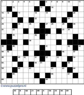Breng letters uit de puzzel over naar de hokjes met hetzelfde nummer. Horizontaal: 1 deel v.d. week 6 kaassoort 12 bereide dierenhuid 14 melkklier 15 te koop 17 vervoer 20 personal computer 21 bouwland 22 pl. in Gelderland 23 gevangenisruimte 24 Chinese munt 25 hoogte 27 hok met tralies 30 en andere 31 blokjesspeelgoed 33 maatstaf 35 hartige hap 37 ettergezwel 38 boerderij 40 grap 41 nauwe doorgang 44 bijbelse figuur 46 riv. in Duitsland 48 Romanum Imperium 49 vreemde snuiter 52 ontwerp 54 lectori salutem 55 sprookjesfiguur 56 eerste vrouw 58 een weinig 59 Europees Kampioenschap 60 wandelstraat 64 selenium 65 larve 66 grondsoort 68 geneigdheid 69 veld. Verticaal: 1 draagdoek 2 reeds 3 zo-even 4 rangtelwoord 5 grote papegaai 7 tweetal 8 klimaatregelaar 9 voorzetsel 10 meester 11 propaganda 13 loofboom 16 deel v.h. been 18 zelfkant 19 zwarte kleverige stof 20 boomvrucht 25 Franse groet 26 beroep 28 stommeling 29 vaccineren 32 Generale Staf 34 Olympische Spelen 36 Grieks eiland 37 wees gegroet 39 volmaakt 40 vader 42 oude lengtemaat 43 cowboyfilm 45 niet gezond 47 witte vlek op paardenhoofd 50 planeet 51 water in Utrecht 52 bakgerei 53 inheemse gifslang 57 vlies 60 amfibie 61 domoor 62 Engels bier 63 voordat 65 met name 67 pers. vnw.