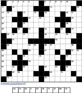 Breng letters uit de puzzel over naar de hokjes met hetzelfde nummer. Horizontaal: 1 Italiaanse drank 6 prikken 12 liefdesgod 13 vrouwtjesaap 15 inzetstuk 17 metalen staafje 19 niet tegen 20 scheepstouw 22 uitroep van pijn 23 lentemaand 25 tot afscheid 26 gravin van Holland 27 te nuttigen 28 bezittelijk vnw. 29 nikkel 31 ajuin 32 ad acta 34 debet 35 senior 38 delfplaats 41 Europeaan 42 Engels telwoord 43 binnenwater 46 staartster 49 civiel ingenieur 50 Evangelische Omroep 51 naamloze vennootschap 52 rekening-courant 54 een zeker iemand 55 onwerkelijk 57 één en ander 58 laatstgenoemde 59 gelooide dierenhuid 60 de dato 61 vod 63 filmpersonage 64 breinaald 66 honingdrank 67 staat in Amerika 69 huwelijkspartner 71 najaar 72 voetbalterm. Verticaal: 2 ondersoort 3 voormiddag 4 cocon 5 eerste bekendmaking 7 gehakte biefstuk 8 dopingmiddel 9 kunstmatige intelligentie 10 griezelig 11 ruiterlansier 14 vrolijk en bekoorlijk 16 geluid (voorvoegsel) 18 volk 19 hoofdstad van Tsjechië 21 oefenstuk (muziek) 24 als boven 30 vaarwel (Frans) 33 soort appel 36 vliegende schotel 37 enzovoort 39 familielid 40 boerenbezit 43 loterijspel 44 laaghartig 45 soort kers 46 handigheid 47 gelijkluidend 48 deel v.e. trap 49 strijkinstrument 53 jonge militair 56 editie 62 gard 63 koraalbank 65 zelfkant 66 voormalig Chinees heerser 68 Hoge Raad 70 Japans bordspel.