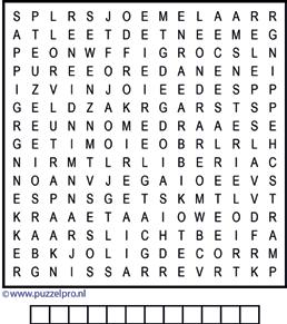 De woorden zitten horizontaal, verticaal en diagonaal in alle richtingen in de puzzel verstopt. Ze kunnen elkaar overlappen. Zoek ze op en streep ze af. De overblijvende letters vormen achter elkaar gelezen de oplossing.
