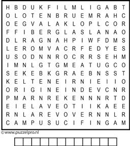 De woorden zitten horizontaal, verticaal en diagonaal in alle richtingen in de puzzel verstopt. Ze kunnen elkaar overlappen. Zoek ze op en streep ze af. De overblijvende letters vormen achter elkaar gelezen de oplossing.