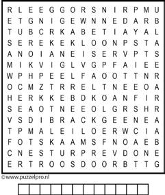 De woorden zitten horizontaal, verticaal en diagonaal in alle richtingen in de puzzel verstopt. Ze kunnen elkaar overlappen. Zoek ze op en streep ze af. De overblijvende letters vormen achter elkaar gelezen de oplossing.