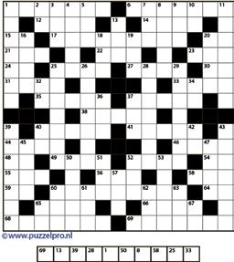 Horizontaal: 1 geul 6 vaste lezer 12 nors 14 bakruimte 15 peuter 17 ambassadeur 20 nummer 21 pluk haar 22 eigenwaarde 23 zeehond 24 als onder 25 magneetband 27 verdikte huid 30 onzes inziens 31 graanpakhuis 33 Ierland 35 hijswerktuig 37 onder grondse trein 38 liefdevol 40 rustpoos 41 landbewerking 44 las 46 winderig koud 48 tot afscheid 49 zwaardwalvis 52 blijvende vijandschap 54 noordoost 55 eenieder 56 gard 58 domkop 59 gouden tientje 60 werphout 64 Evangelische Omroep 65 zwart paard 66 zwaar metaal 68 gymnastiekoefening 69 verbond. Verticaal: 1 vleesgerecht 2 getijde 3 amfibie 4 heel goed 5 loofboom 7 halsbont 8 eivormig 9 zo-even 10 de on bekende 11 ontzag 13 zwaar en traag 16 hok met tralies 18 watering 19 afgemat 20 Scan dinaviër 25 orkaan 26 blut 28 werklust 29 danig 32 laatste kwartier 34 in oprichting 36 ontkenning 37 honingdrank 39 onkreukbaar 40 vader 42 momenteel 43 voorrede 45 mestvocht 47 verbond 50 afvoergoot 51 behoeftig 52 afgelegen 53 mannenstem 57 domoor 60 bundel 61 tijdperk 62 Engels bier 63 opperwezen 65 met dank 67 doctor.